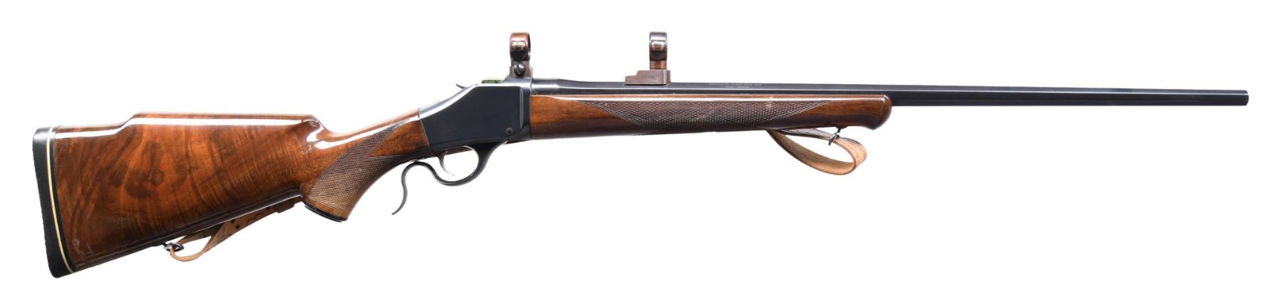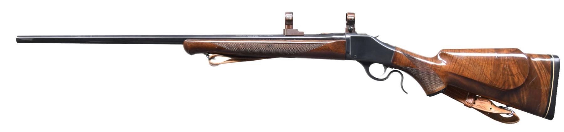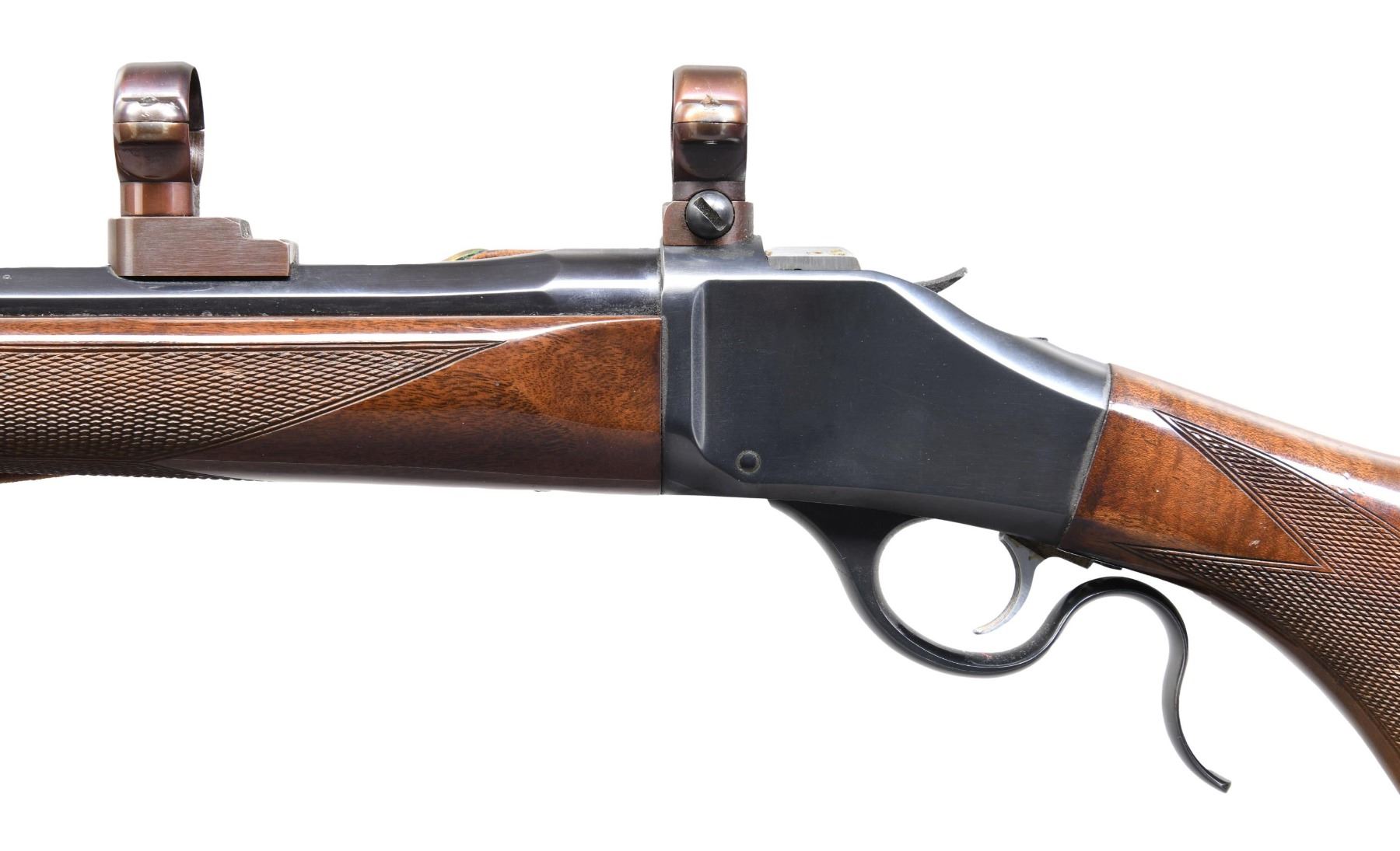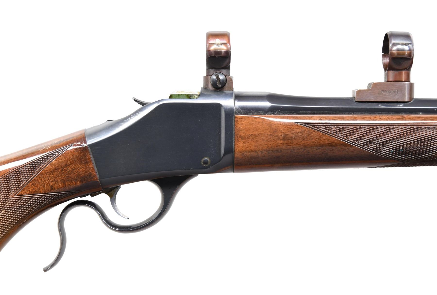 Cal. 25-06. S# 4933W47 (1974). Bbl. 26", sightless, tapered octagon. Falling block action is based on the Winchester model 1885 HI Wall. Blue finish. Schnable-tipped forearm and Monte Carlo cheekpiece stock of fancy walnut. Features include a gloss finish, cut checkering, plastic grip cap, and original Browning solid black pad. Boyt leather military-style sling on original swivels. Browning 2-piece mounts. CONDITION: 98% blue. Original wood finish shows numerous scratches and marks. Very good bore. (24-5365/MD). MODERN (CURIO on Jan. 1st, 2025). $800-1,200.