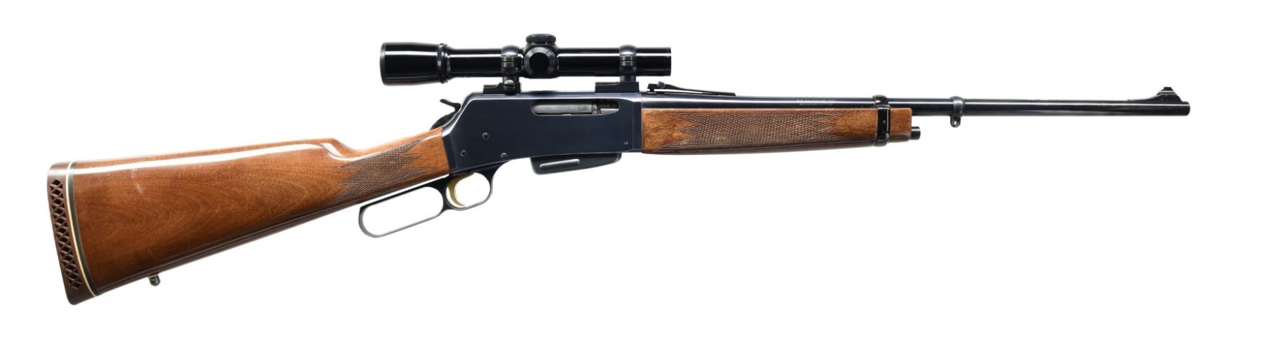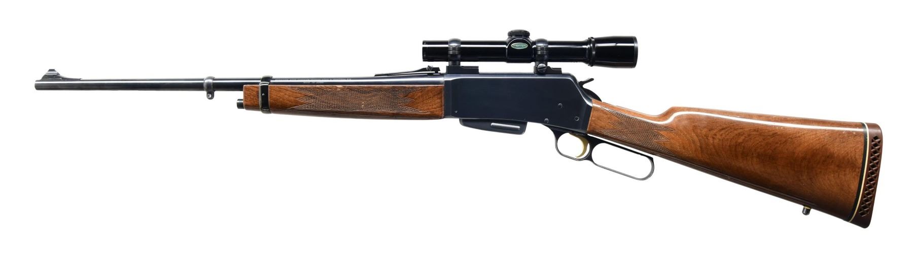 Cal. 308 Win. S# 14824PM127. Bbl. 20". Gold bead front sight. Adjustable rear sight. Receiver-mounted Weaver 2.5x power scope with duplex crosshair reticle and very good optics. Japanese-made BLR rifle. Blued finish with gold trigger. Checkered walnut stock and forend with bottom-mounted sling swivels. Factory recoil pad. LOP: 13 3/4". MAGS: one 4 rd., detachable. CONDITION: stock retains much of its glossy finish with a couple dings, some scattered handling wear, and light flaking. Metal retains 97% original blue with some edge wear. Action is functional when hand-cycled. Very good bore. (24-3447/MJC). $600-900.