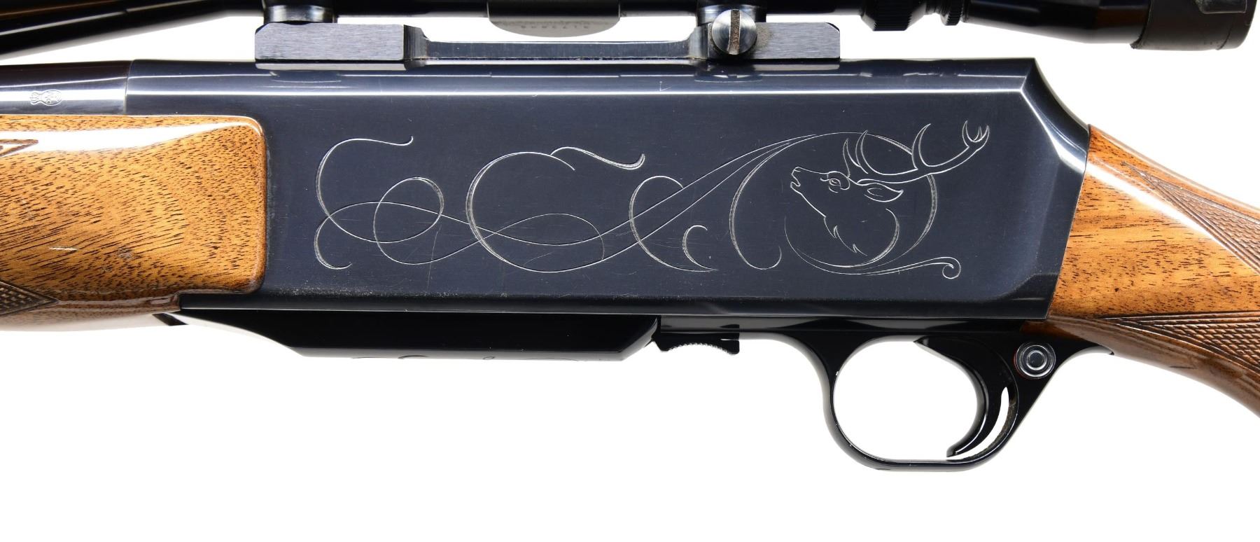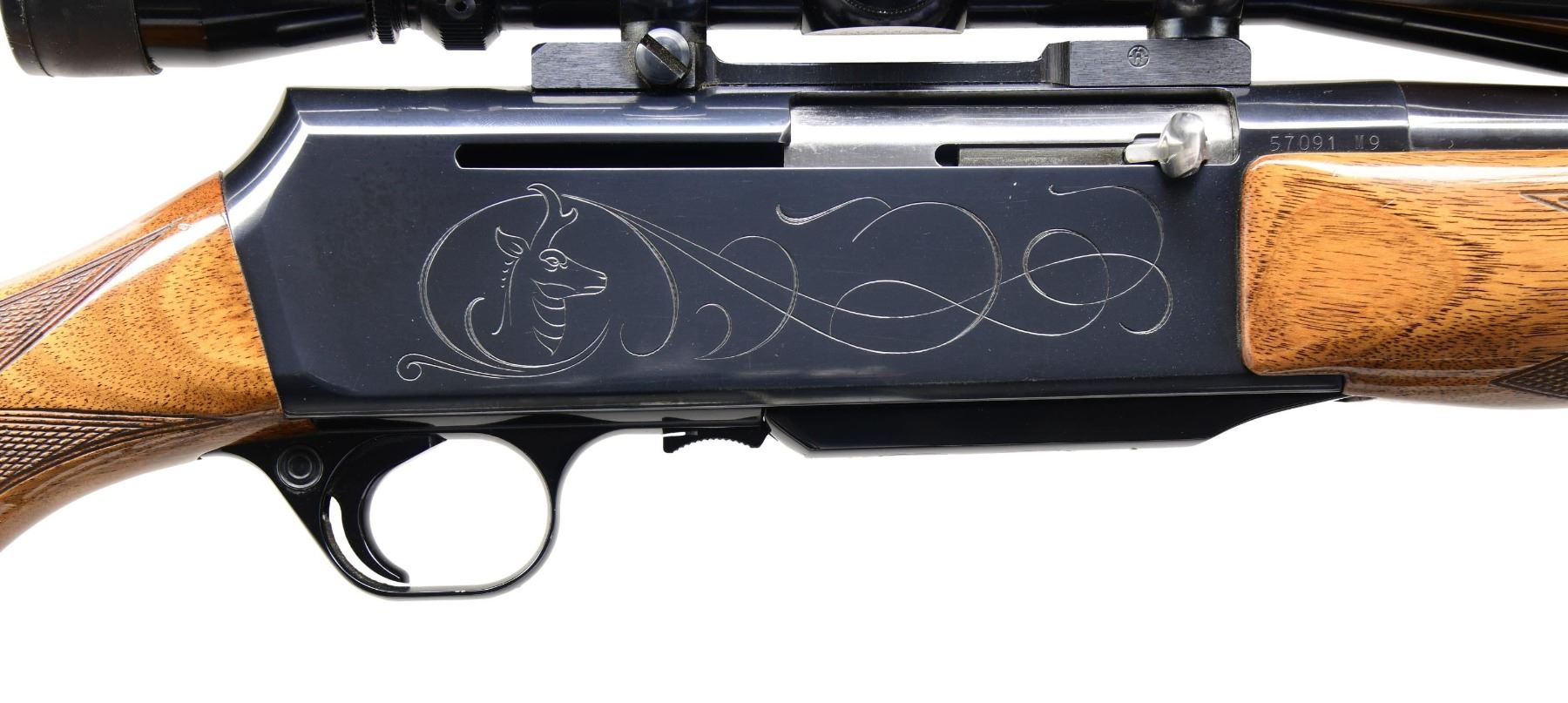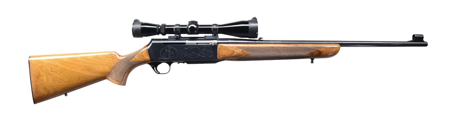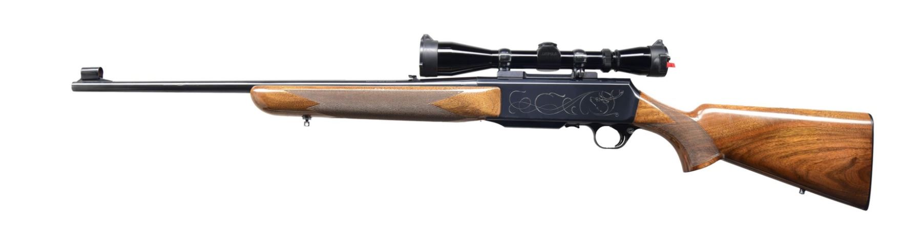 Cal. 30-06. S# 570291M9. Bbl. 23". Hooded bead front sight. Flip up rear sight. Receiver-mounted Leupold 3-9x power scope with duplex crosshair reticle, very good optics, and flip-up Butler Creek covers. 1969 mfg. Belgian Grade II BAR with game engraving on both sides of receiver. Blued finish. Checkered walnut pistol grip stock and forend. Bottom-mounted sling studs. MAGS: one 4 rd. that shows some light dings on bottom. CONDITION: stock retains a high degree of varnish with some scattered light scratches and handling marks. Metal retains 97% original blue with some light edge wear on receiver and bbl. Action functions properly when hand-cycled. Very good bore. PROVENANCE: from the lifelong collection of Jim Williams. (24-2716/MJC). CURIO. $800-1,200.