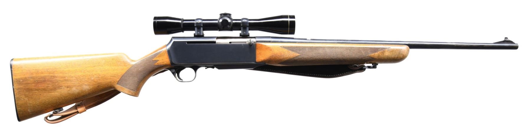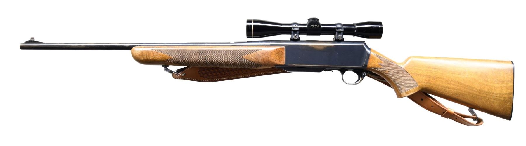 Cal. 243 WIN. S# 33640M75. Bbl. 22" with dovetailed bead front sight on a serrated ramp and empty dovetail where the rear bbl sight was removed. Leupold M8-6X duplex reticle scope. Checkered pistol grip walnut stock set with QD Sling swivels, leather sling, & Browning buttplate. CONDITION: This good little hunting rifle shows signs of field use with thinning finish from being carried and wear to the high edges and portions of the bbl from resting in a vehicle gun rack. Stock is sound with thinning finish and handling marks. Very good bore with nice rifling. MODERN (24-4281/ZAL) $400-600