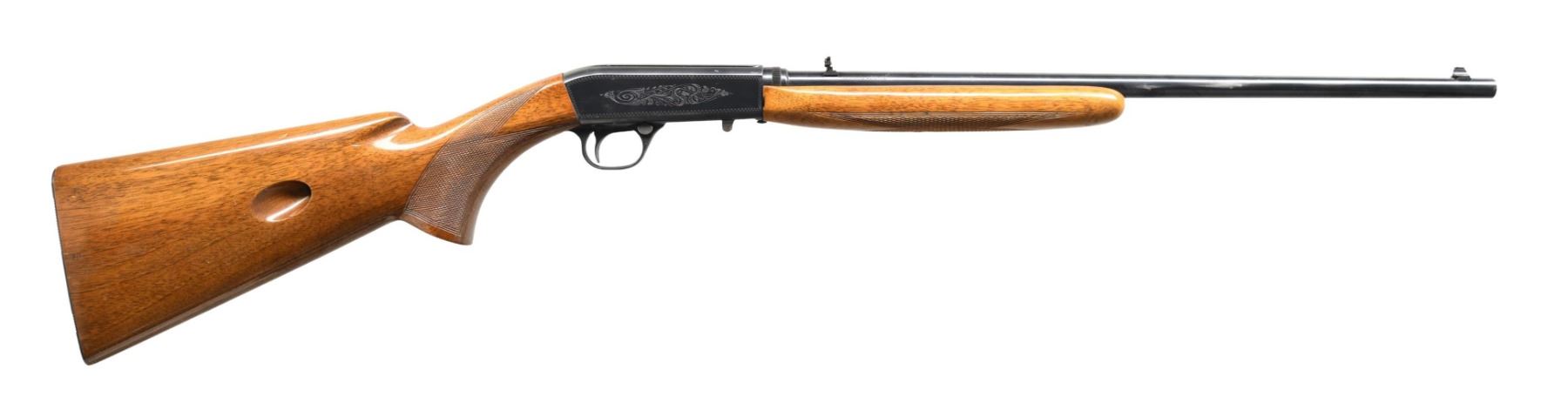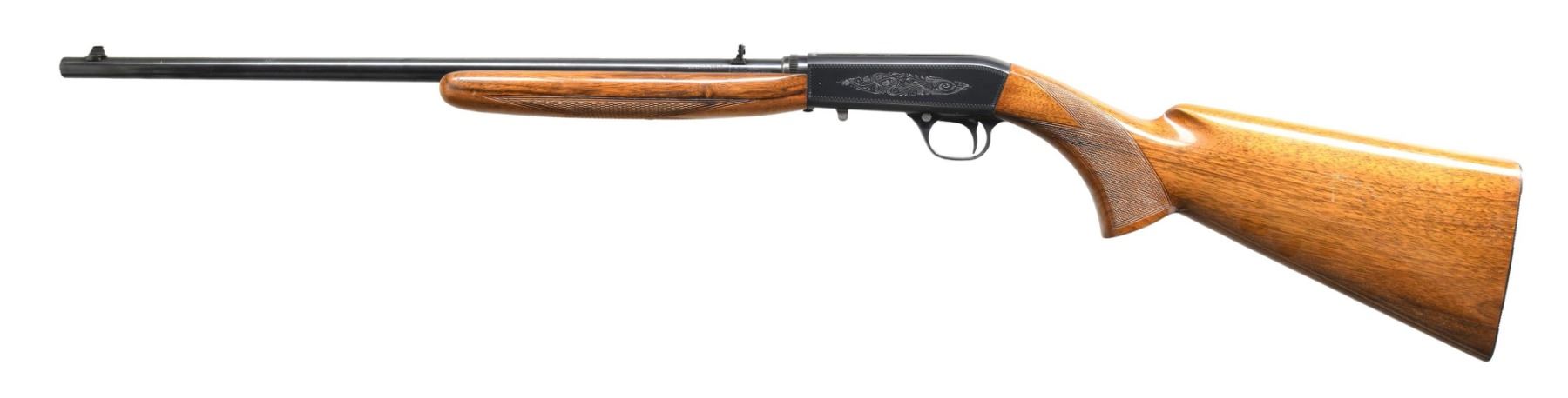 RIFLE. Cal. 22 LR. S# 3T53686. Bbl. 19 3/8". SA-22 semi-automatic takedown rifle mfg. in Belgium and imported by Browning Arms Company in 1963. Top of bbl. is marked with Browning's importer information above "MADE IN BELGIUM", with "22 LONG RIFLE" and Belgian proofs marked on left, as well as "BROWNING PATENTS" marked on the right. Sides of the receiver are engraved with a wavy line border that features a foliate motif present at the center. Metal components exhibit a blue finish overall, save for the bolt, which is polished in-the-white. Checkered wood pistol grip buttstock and forend. Brass beaded blade front sight with flip-up U-notch rear sight. CONDITION: metal components retain the majority of their original factory blue finish, exhibiting a few small spots of wear, some small scattered spots of light to mild surface oxidation, as well as a couple of small spots of finish loss on the right side of the bbl. from prior cleaning. Receiver exhibits a few scattered nicks and superficial handling marks, with two small spots of marring at the front of the sight grooves. Very bright bore, exhibiting good rifling throughout. Wood furniture shows scattered marks and impressions from handling and storage but otherwise remains sturdy and serviceable. PROVENANCE: from the lifelong collection of Jim Williams. (24-2719/MLW). CURIO. $700-1,100.