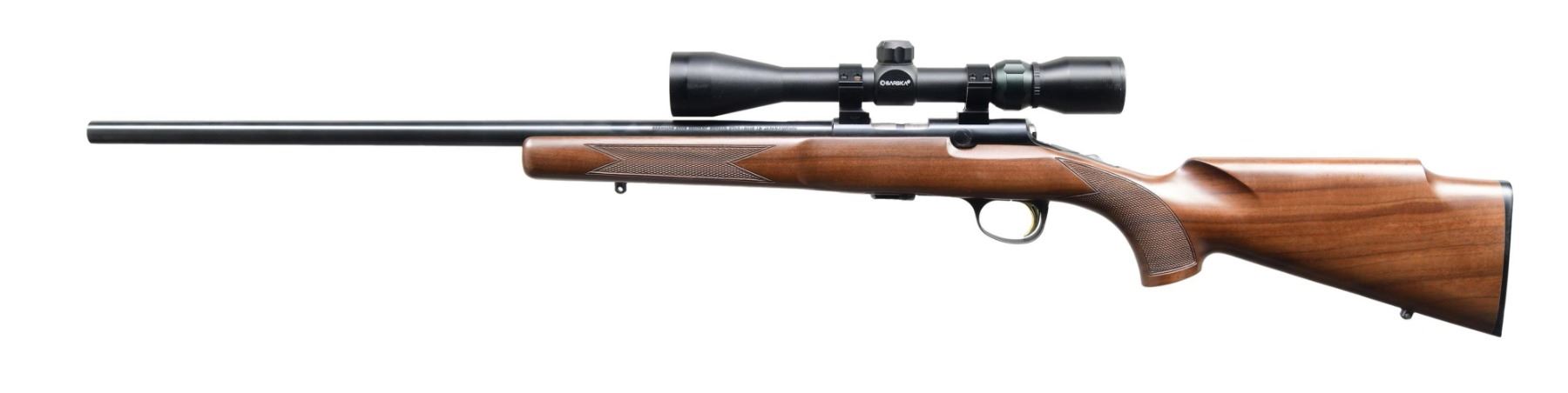 WITH MATCHING NUMBERED BOX. Cal. 22 LR. S# 10558MP253 (2008). Heavy, free-floating 22" barrel with recessed crown. Based on original T-Bolt action with enlarged bolt handle. Barska 3-9x40 scope with duplex reticle on Talley bases. Checkered stain finished walnut stock with raised cheekpiece. MAGS: one 10 rd. UNATTACHED ACCESSORIES: near excellent metal and wood finish. Near excellent bore. Good scope with serviceable optics. (24-3888/MD). MODERN. $400-600.