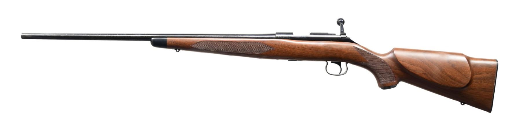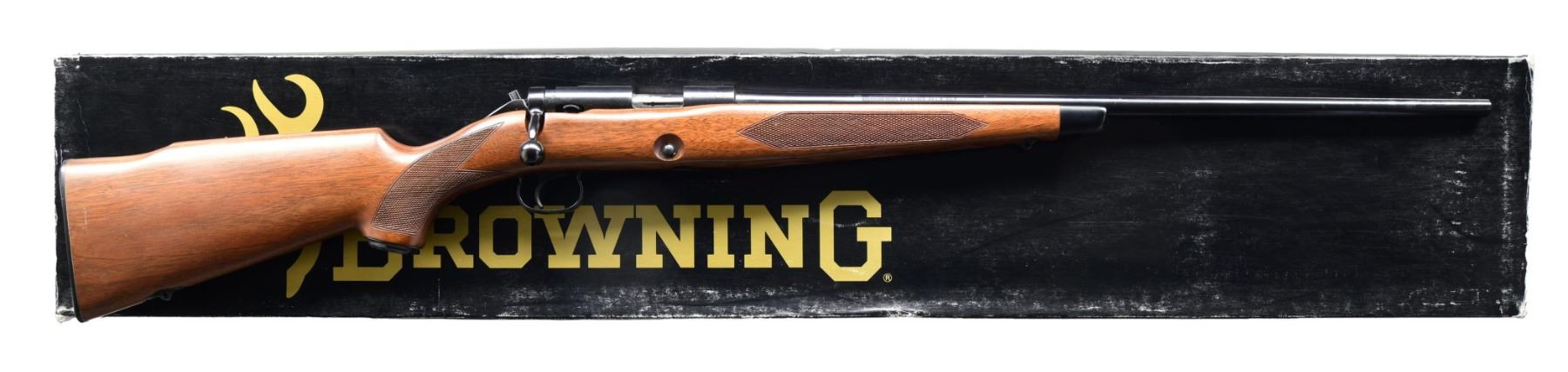 Cal. 22 LR. S# 00066NZ496. Bbl. 24". Rifle is devoid of sights, but receiver has six screw holes for sight mounting. Four holes are on top of the receiver and two on the left rear. Japanese-made Browning Model 52. Blued finish. Checkered walnut pistol grip stock with left side cheekpiece and bottom-mounted sling studs. MAGS: one 5rd. UNATTACHED ACCESSORIES: matching numbered factory box. CONDITION: all aspects are near new; in the box. (24-3091/MJC). MODERN. $300-450.