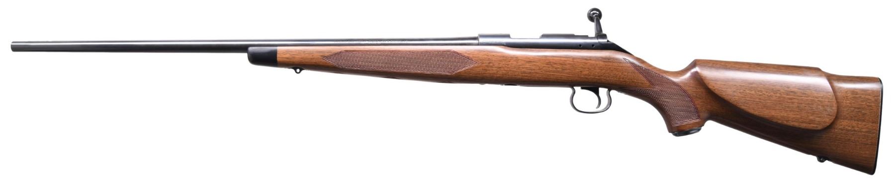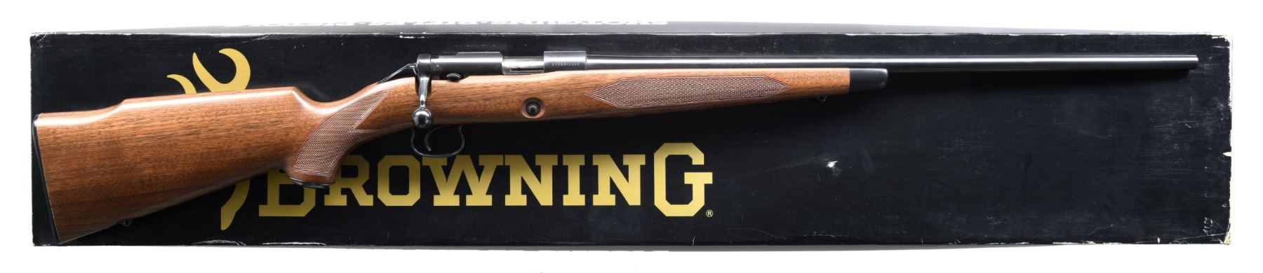 MATCHING FACTORY BOX. Cal. 22 LR. S# 01593NZ496. Bbl. 24". Model 52 bolt action rifle mfg. in Japan and imported/retailed by Browning Arms Company. Left side of the bbl. is marked with Browning's importer information above "MADE IN JAPAN", with the model and cal. designations marked on the right. Left side of the receiver is marked with the Browning trademark logo, with the S# marked on the right. Metal components exhibit a blue finish overall, save for on the bolt body, which is polished in-the-white. Checkered wood Monte Carlo pistol grip buttstock, with cheek rest and black tipped forend. Receiver is factory drilled and tapped. MAGS: 2 5-rd. UNATTACHED ACCESSORIES: Browning scope mounts, as well as a matching factory box. CONDITION: fine, with metal components retaining bountiful amounts of their original factory blue finish, exhibiting a few light superficial handling marks overall. Mirror bore, exhibiting well defined rifling throughout. Stock is excellent overall. Box shows some light to mild exterior wear from handling and storage, as well as a hole in the lid, but otherwise remains sturdy and serviceable. (24-5001/MLW). MODERN. $600-900.