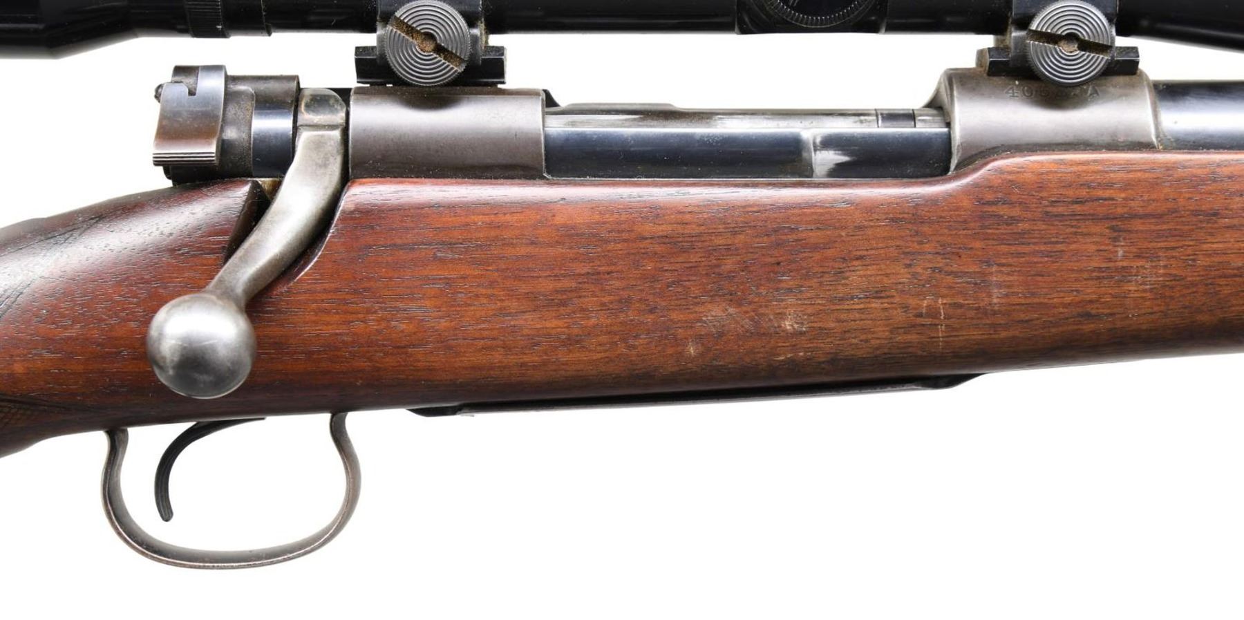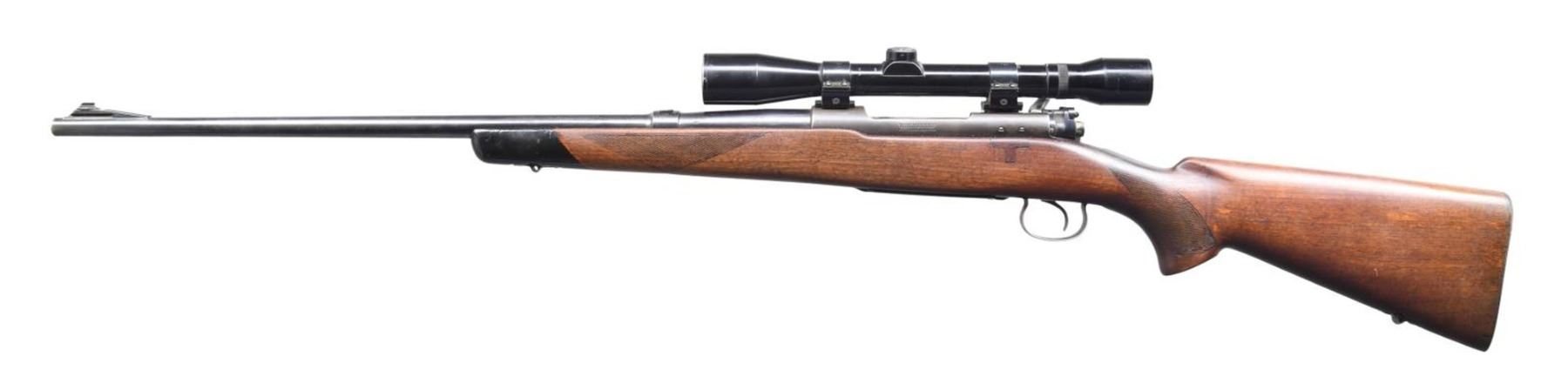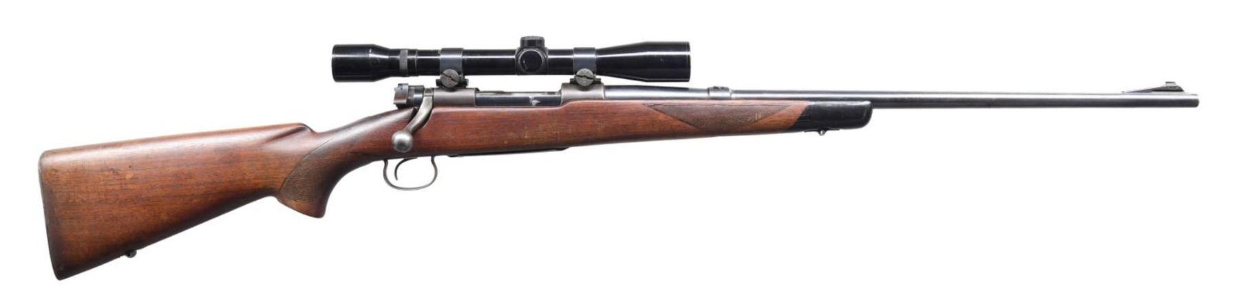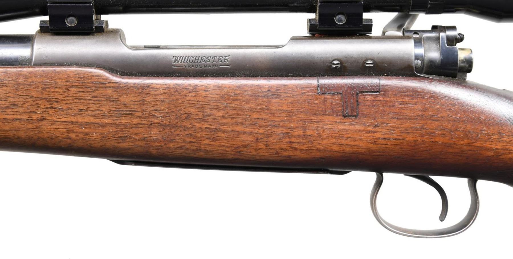 Cal. 22 Hornet. S# 40532A. Bbl. 24 1/4". Model 54 bolt action rifle mfg. by Winchester in 1933. Left side of bbl. exhibit the model designation, followed by the Winchester trademark logo and cal. designation, with Winchester's mfg. information marked on the right. Left side of receiver is marked with the Winchester trademark logo on the receiver wall, with the S# marked on the right of the chamber. Metal components exhibit a blue finish. Checkered wood buttstock has been sanded and revarnished at one time. Left side of receiver has been drilled and tapped (likely for an aperture sight), with the stock exhibiting a replaced section below. Receiver is mounted with a Westernfield 6x32 60-1209 scope. CONDITION: metal components retain large amounts of their original factory blue finish, exhibiting areas of wear and thinning, with consistent mild surface oxidation overall. Receiver exhibits wear and thinning that shows through to a gray patina. Mirror bore, exhibiting some light pitting towards the muzzle and retaining well defined rifling throughout. Stock exhibits some scattered marks from handling and storage, but otherwise remains sturdy and serviceable. Top section of buttplate exhibits moderate oxidation. Scope is hazy. (24-1156/MLW). CURIO. $600-900.