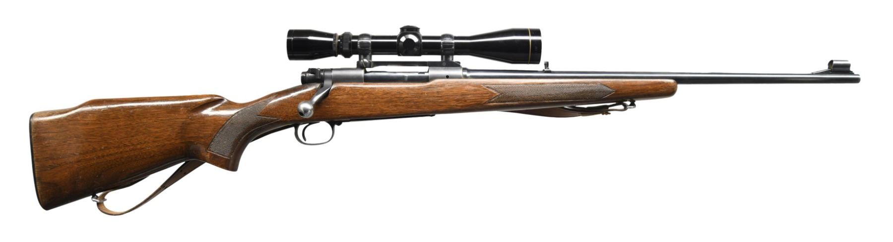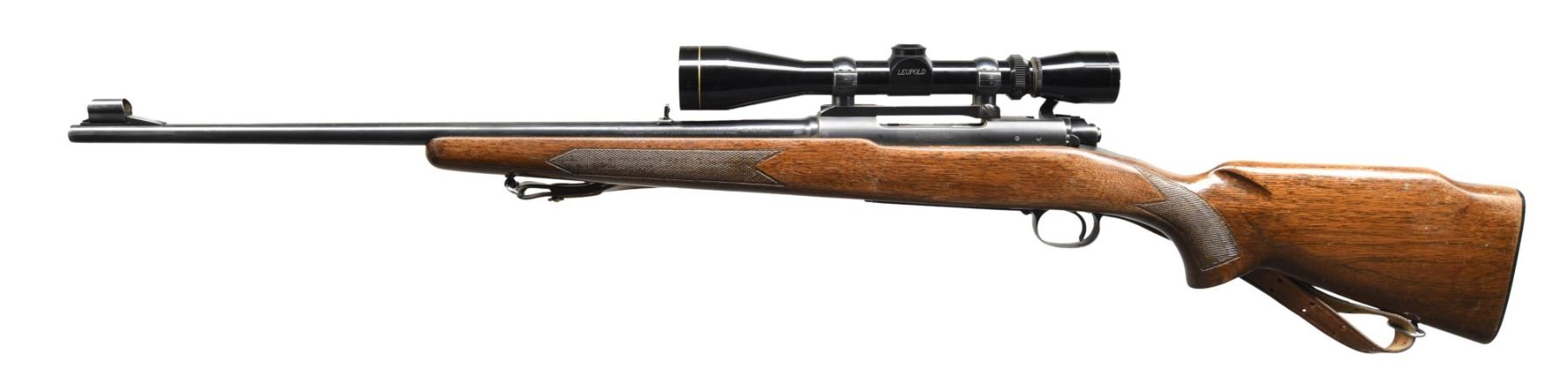 ACTION RIFLE. Cal. 30-06. S# 527119. Bbl. 22" with a light taper. Hooded ramp bead front sight with folding leaf rear sight. Leopold Vari-X IIc 3-9x40 gloss-finished scope with a duplex reticle on a one-piece Redfield mount. Action features a claw extractor and a three-position safety with an alloy floorplate and trigger guard. Bolt body is numbered to the rifle. Monte Carlo walnut sporter stock with hand-checkering, sling swivels, and plastic buttplate. Hunter leather sling. Mfg. 1961. CONDITION: 70% lightly worn blue. Stock has an added finish over the wear, with numerous dents and handling marks. Buttplate is rounded at the toe. Very good bore. Scope has clear optics. (24-5452/DS). CURIO. $600-900.
