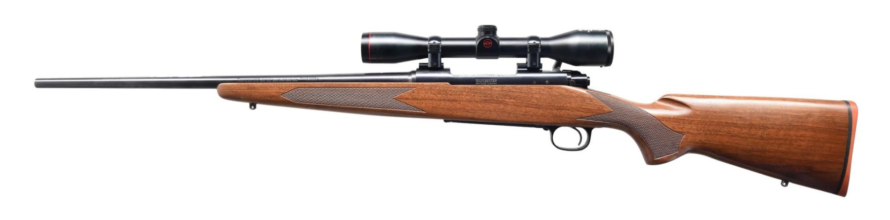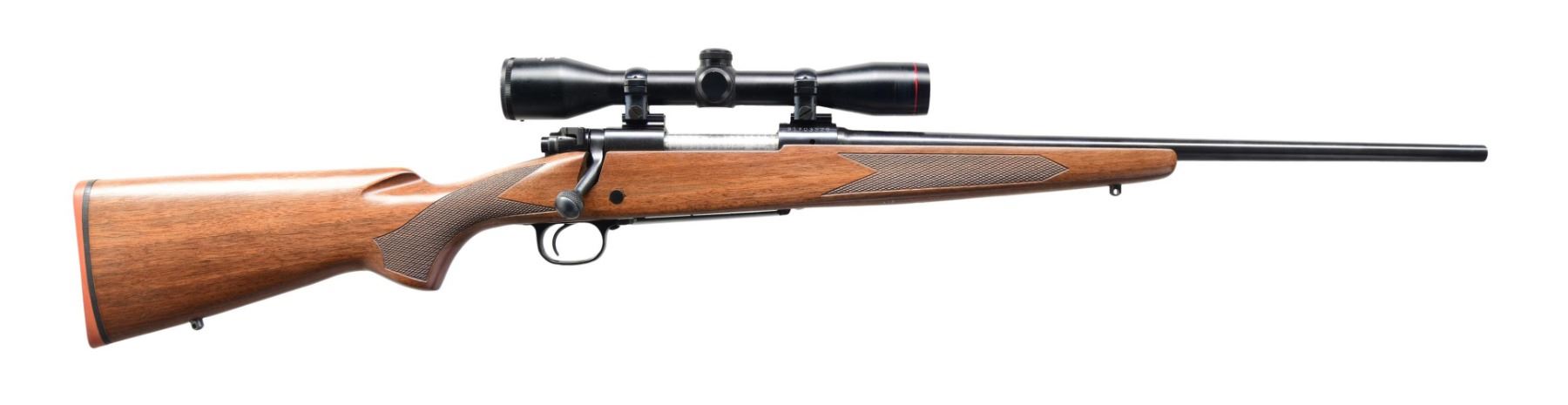 Cal. 30-06. S# G1703526. Bbl. 19 3/4". Model 70 bolt-action carbine mfg. by Winchester. Left side of the bbl. is marked with the Winchester trademark logo, followed by "MODEL 70 CARBINE" and the cal. designation, above Winchester's mfg. information. Left side of the receiver is marked with the Winchester trademark logo, with the S# marked on the right side of the chamber. Metal components exhibit a blue finish overall, save for the bolt body, which is jeweled, as well as the aluminum trigger guard, which exhibits a black enamel finish. Checkered wood pistol grip buttstock. Receiver is mounted with a Simmons Model 1032 4x32 wide-angle scope. Underside of bolt is matching to the receiver via the last 3-digits "526" in electro-pencil. CONDITION: metal components retain bountiful amounts of their original factory finishes, exhibiting a few light superficial handling marks overall. Mirror bore, exhibiting some spots of grease while retaining well-defined rifling throughout. Stock is excellent overall. Scope retains a clear and sharp optic. (24-2835/MLW). MODERN. $400-600.