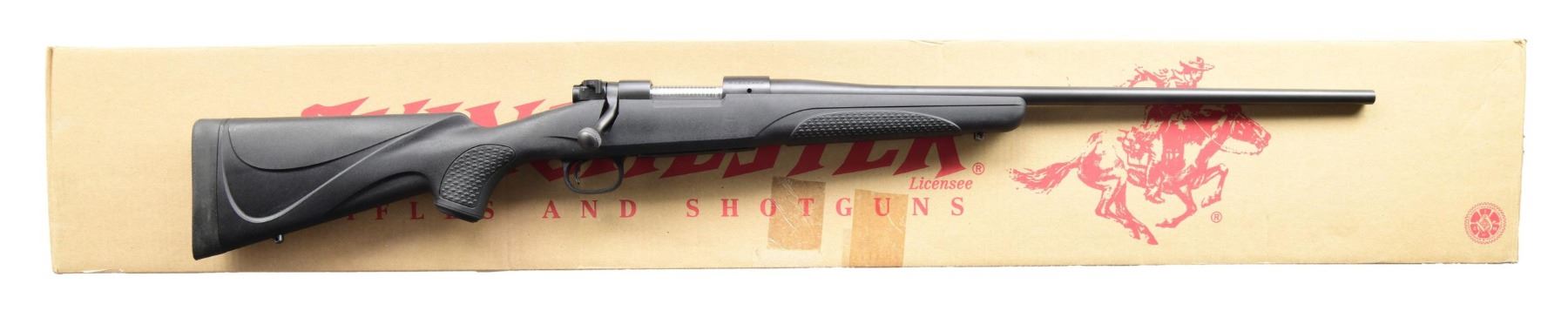 WITH MATCHING FACTORY BOX. Cal. 223 WSSM. S# G2512463. Bbl. 22 1/8". Model 70 bolt action rifle mfg. by Winchester. Left side of the bbl. is marked with the Winchester trademark logo, followed by the model and cal. designations above Winchester's mfg. information. Left side of receiver is marked with the Winchester trademark logo, with the S# marked on the right side of the receiver. Metal components exhibit a matte blue finish overall, save for the bolt body, which is jeweled. Textured black polymer pistol grip buttstock with black polymer trigger guard and floorplate. Receiver is factory drilled and tapped. UNATTACHED ACCESSORIES: matching factory box. CONDITION: near new, with metal components retaining virtually all of their original factory finishes overall. Mirror bore, exhibiting a layer of grease while retaining well-defined rifling throughout. Polymer stock is excellent overall. Box shows some light exterior wear from handling and storage but otherwise remains sturdy and serviceable. (24-3622/MLW). MODERN. $400-600.