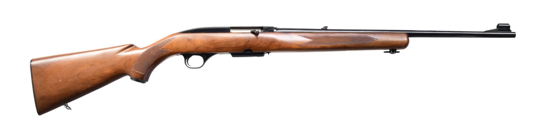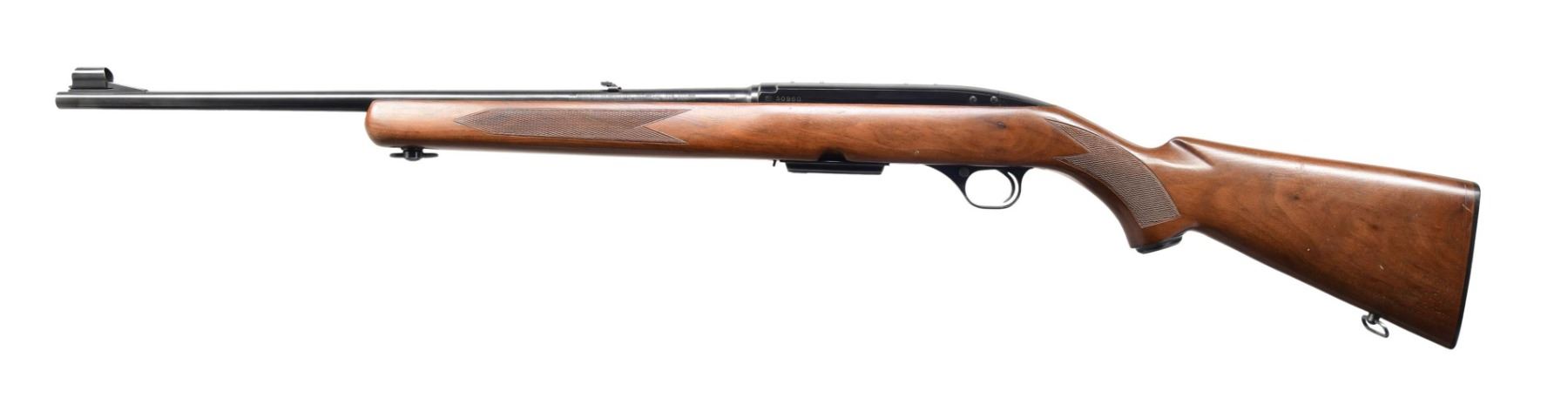 Cal. 308. S# 50960. Bbl. 21 3/4". Model 100 semi-automatic rifle mfg. by Winchester in 1962. Left side of the bbl. is marked with the Winchester trademark logo, followed by the model and cal. designations, with the S# marked on the left side of the receiver. Metal components exhibit a blue finish overall, save for the bolt, which is polished in-the-white, as well as the aluminum trigger guard, which exhibits a black anodized finish. Checkered wood pistol grip buttstock. Ramped, hooded, and aluminum beaded blade front sight with flip-up U-notch rear sight. Receiver is drilled and tapped. MAGS: one 4-rd. CONDITION: excellent, with metal components retaining bountiful amounts of their original factory blue finish overall, exhibiting a few superficial handling marks, as well as a couple minute spots of light surface oxidation. Mirror bore, exhibiting a couple of small spots of what appears to be light surface oxidation towards the muzzle, while retaining well-defined rifling throughout. Stock exhibits some scattered marks and a few minor impressions from handling and storage, but otherwise is very good overall. A very nice example of a second-year production Winchester Model 100 rifle. (24-3364/MLW). CURIO. $500-700.