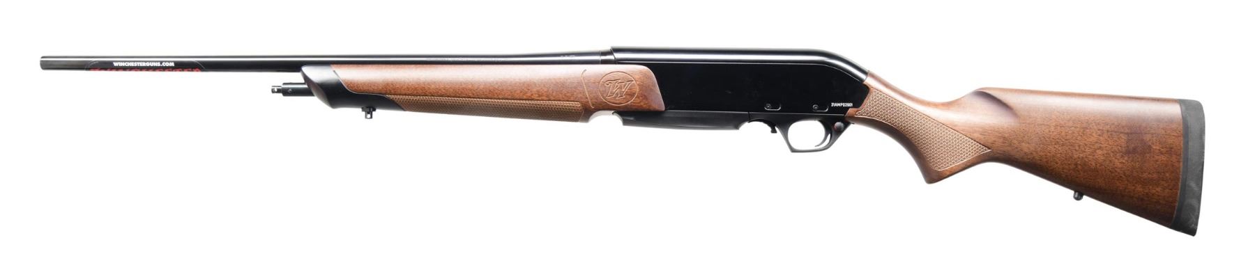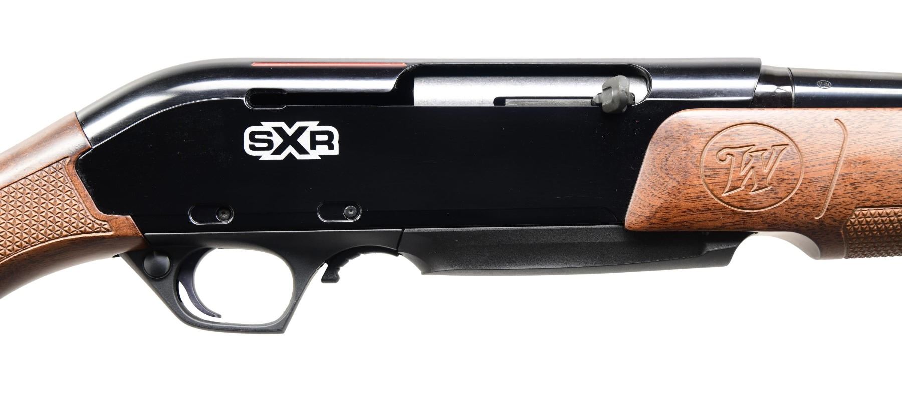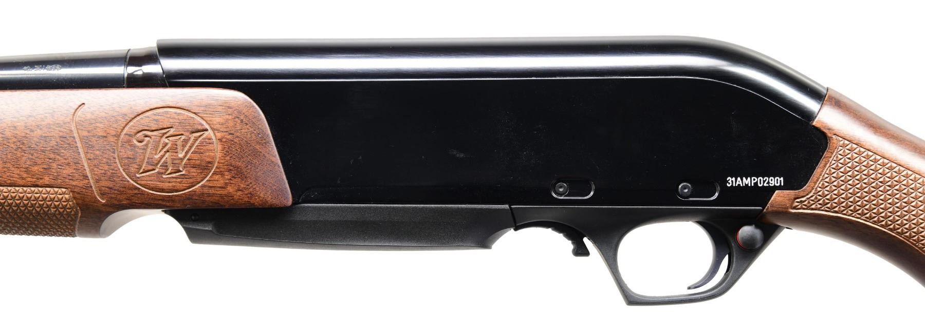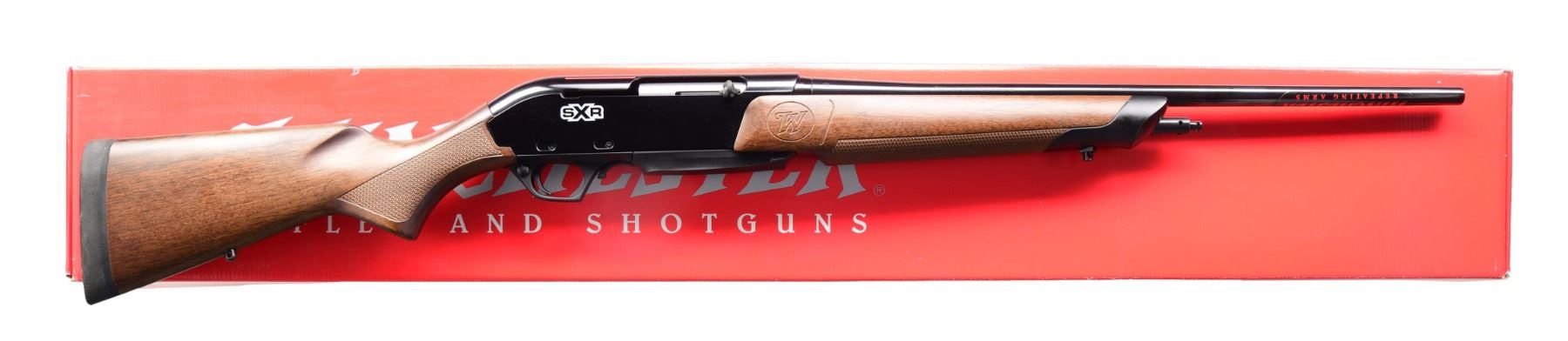 RIFLE WITH MATCHING FACTORY BOX. Cal. 30-06. S# 31AMP02901. Bbl. 22". Super X Rifle (SXR) semi-automatic rifle mfg. in Belgium by FN, imported by BACO, and retailed by Winchester. Left side of the bbl. is marked with the Winchester trademark logo, followed by the model and cal. designations, with Belgian proofs marked towards the breech. Right side of bbl. is marked "Made by FN - Belgium", followed by BACO's importer information. Left side of the receiver is marked with the S#, with "SXP" marked on the right. Aluminum receiver exhibits a black finish, with the steel bbl. exhibiting a blue finish. Checkered wood buttstock and forend, with black polymer trigger guard and mag. floorplate. Top of the receiver is factory drilled and tapped. MAGS: one 4-rd. CONDITION: near new, with metal components retaining virtually all of their original factory finishes overall. Mirror bore, exhibiting grease while retaining well-defined rifling throughout. Wood furniture is excellent overall. Box exhibits some mild exterior wear and a few small tears, but otherwise remains sturdy and serviceable. (24-3272/MLW). MODERN. $500-700.