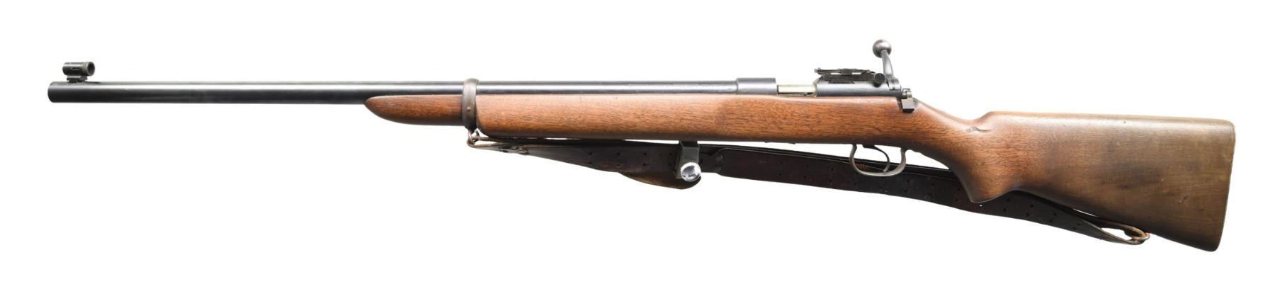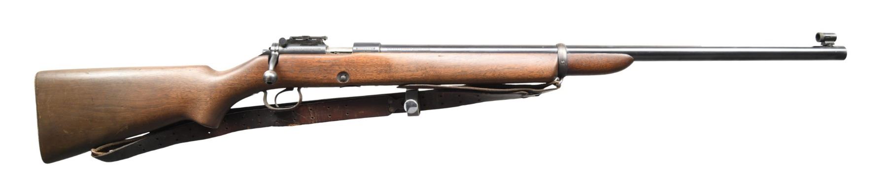 Cal. 22 LR. S# 38906. Bbl. 28" heavy target weight. Globe front sight w/ graduated leaf receiver sight. Band fastened walnut target stock w/ checkered steel buttplate. Al Freeland leather target sling on original swivels. Mfg. 1937. MAGS: 1 properly marked 5 rd detachable. CONDITION: bbl. & receiver have 90% lightly worn blue. Floorplate & trigger guard have faded to brown. Bbl. has 4 added open holes for scope block attachment. Stock has worn finish showing scratches, marks & dents. Bore retains good rifling. (24-4172/DS). CURIO. $600-900.