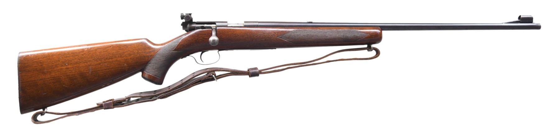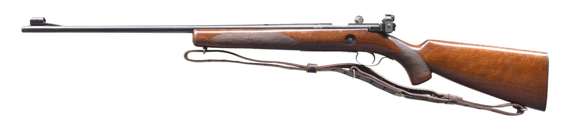 Cal. 22 LR. S# 34358. Bbl. 24" tapered round. Hooded ramp bead front sight., filler in rear dovetail w/ Lyman 57E receiver sight. Walnut sporter stock w/ hand checkering, hard rubber grip cap & grooved steel buttplate. Military style sling on original swivels. Floorplate is stamped "SPORTING". MAGS: none included. CONDITION: bbl. & receiver have 70% lightly worn blue. Floorplate has faded to gray. Stock has worn original finish & checkering showing numerous scratches, marks & small dents. Bore is generally bright w/ lightly worn rifling. (24-4154/DS). CURIO. $400-600.