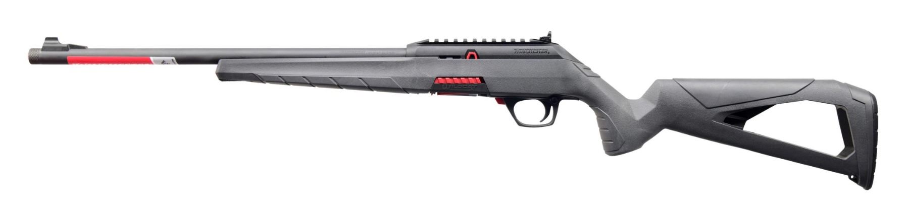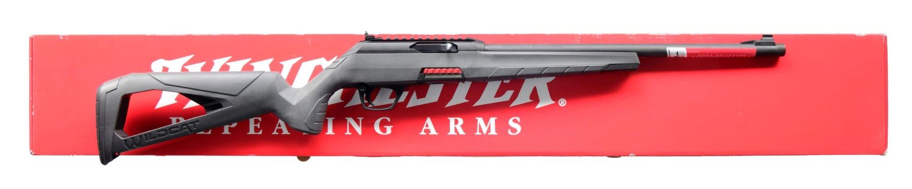 RIFLE WITH MATCHING BOX. Cal. 22 LR. S# TF614-21Y21498. Bbl. 16 3/4". Wildcat semi-automatic rifle mfg. in Turkey by Istanbul Silah, imported by BACO Inc., and retailed by Winchester. Left side of receiver is marked with the Winchester trademark logo, followed by the model and cal. designations, with Istanbul Silah's mfg. and BACO's importer information marked on the right. Bbl. exhibits a matte gray finish. Black polymer receiver and trigger guard, with gray polymer stock. Threaded muzzle with blade front sight and ghost ring rear sight. MAGS: one 10-rd. UNATTACHED ACCESSORIES: matching factory box. CONDITION: excellent, with the bbl. retaining bountiful amounts of its original factory finish overall. Polymer receiver and stock exhibit a few light superficial handling marks but are otherwise excellent overall. Mirror bore, exhibiting well-defined rifling throughout. Box shows some light exterior wear but otherwise remains sturdy and serviceable. (24-2779/MLW). MODERN. $150-250.