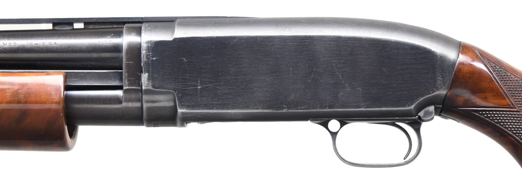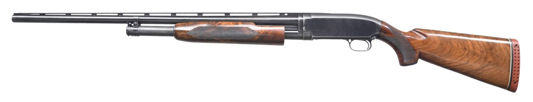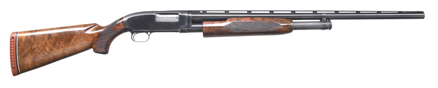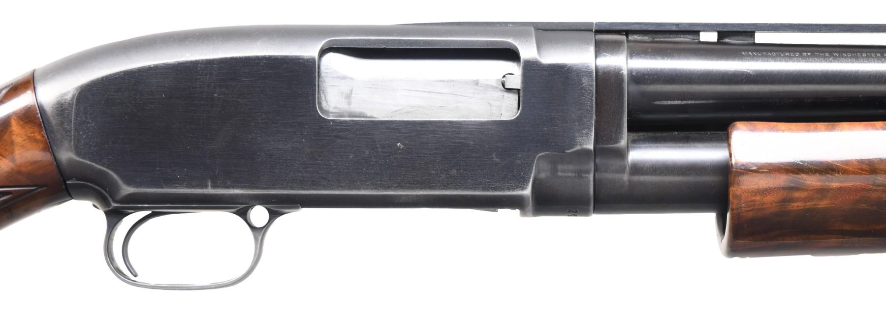 Cal. 12 ga. 2 3/4". S# 242461. Bbl. 28" with large oval post aftermarket Simmons vent rib. Fixed Mod choke. White front bead with aluminum mid bead. Custom beavertail forearm of fancy walnut with hand checkering. Y series straight comb walnut stock with original Winchester ventilated pad. CONDITION: 75% reblued finish showing slide and carry wear with scratches and marks. Wood finish shows scratches and marks. Action is sound. Safety is removed. All adj. on headspace ring is taken up. Good bore. (24-3988/DS). CURIO. $300-500.