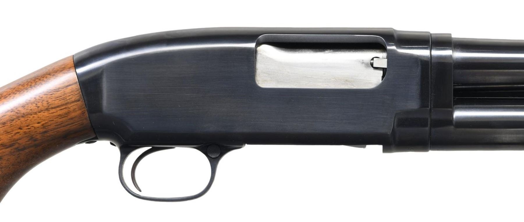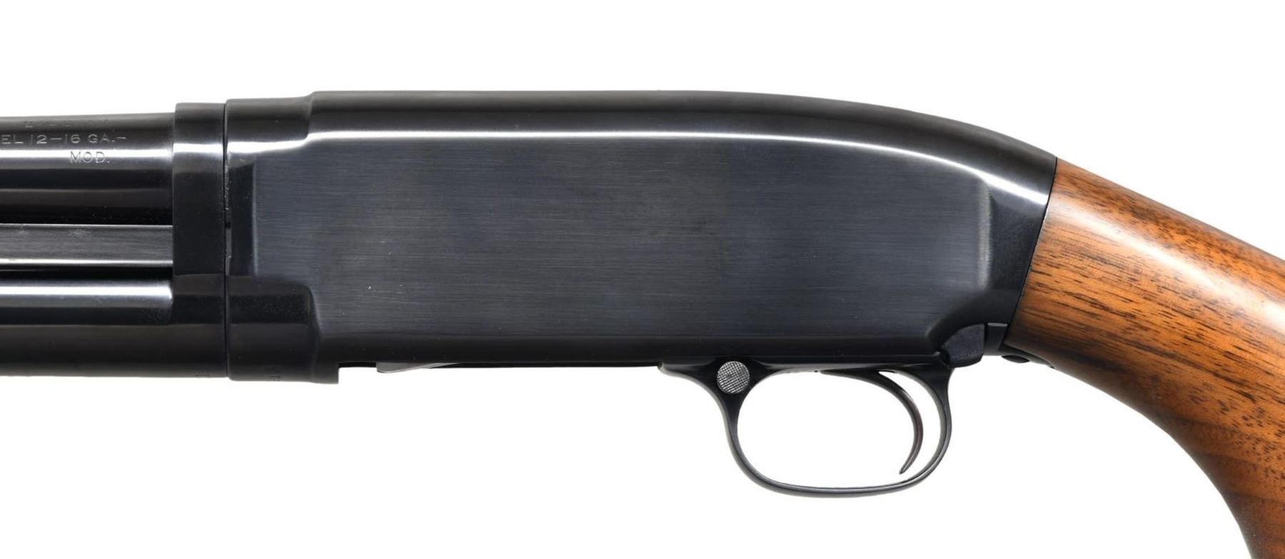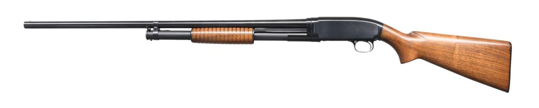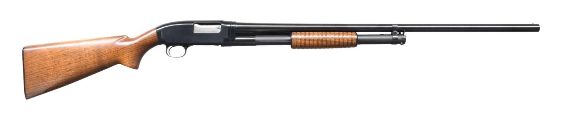Cal. 16 ga. 2 3/4". S# 918413. Bbl. 28", plain of proof steel with fixed Mod choke and steel bead. Small, round, grooved forearm and pistol grip walnut stock with original buttplate. Mfg. 1942. CONDITION: 98% original blue. Very good refinished wood. Sound action. One notch is taken up on bbl. ring. Very good bore. (23-7365/DS). CURIO. $350-500.
