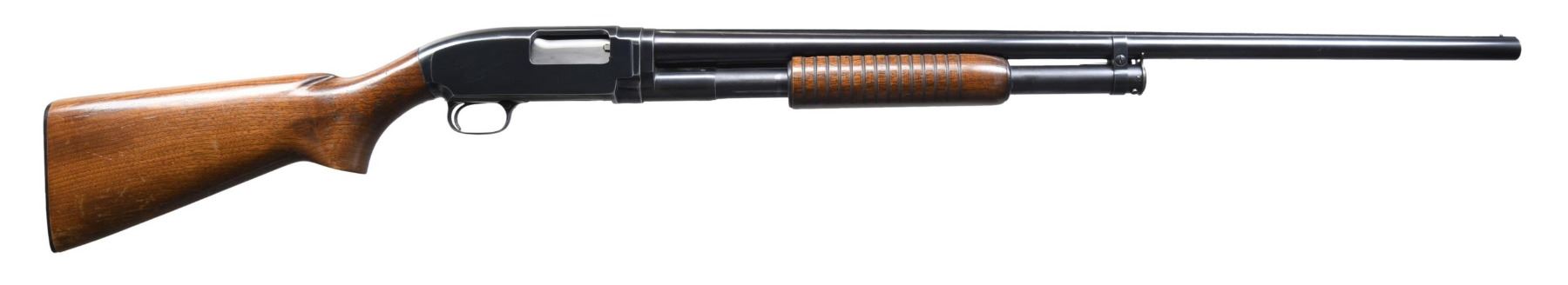 Cal. 12 ga. 2 3/4". S# 1450384. Bbl. 30", with solid rib and fixed full choke. Flat bottom, grooved forearm and pistol gripped stock with original buttplate. Mfg. 1954. CONDITION: over 80% blue, showing edge and carry wear. Wood finish shows wear with spots of finish loss, scratches, and marks. Sound mechanics. Very good bore. (24-5724/DS). CURIO. $350-500.