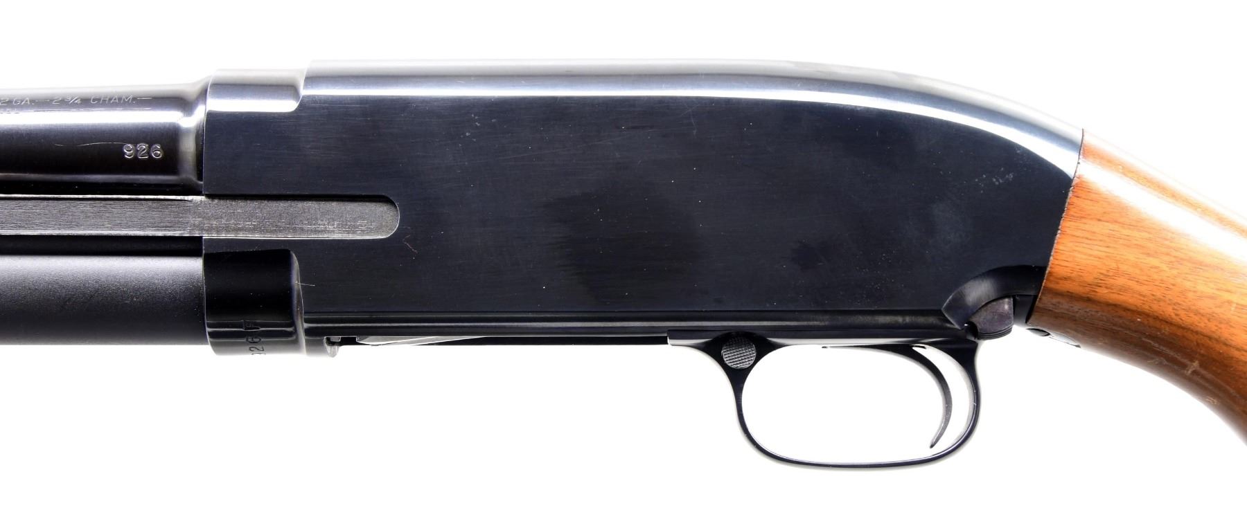 SHOTGUN. Cal. 12 GA, 2 3/4". S# 1808926F. Bbl. 30 1/4". Model 12 Featherweight pump action shotgun mfg. by Winchester circa. 1961. Left side of bbl. is marked with the Winchester trademark logo, followed by the model and cal. designations above "FULL." Metal components exhibit a blue finish overall, save for the aluminum trigger guard, which exhibits a black finish. Plain wood pistol grip buttstock with grooved wood pump. Aluminum bead front sight. Bbl. is matching to the receiver via the last 3-digits of the S# "926." CONDITION: excellent, with metal components retaining bountiful amounts of their original factory finishes overall, save for a few superficial handling marks and a couple small scattered spots of light surface pitting. Mirror bore. Wood furniture shows some scattered marks, minor impressions, and losses to the varnish, but otherwise remains sturdy and serviceable overall. (24-3513/MLW). CURIO. $300-500.