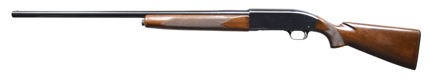 Cal. 12 ga. 2 3/4". S# 24090. Bbl. 28", plain with fixed Mod choke. Steel receiver with alloy trigger guard. Blue finish. Walnut forearm and pistol grip stock with cut checkering and original buttplate. Mfg. 1954. CONDITION: 90% blue, showing edge wear on action. Original wood finish shows light wear with scattered small marks. Very good bore. (24-5746/DS). CURIO. $250-350.