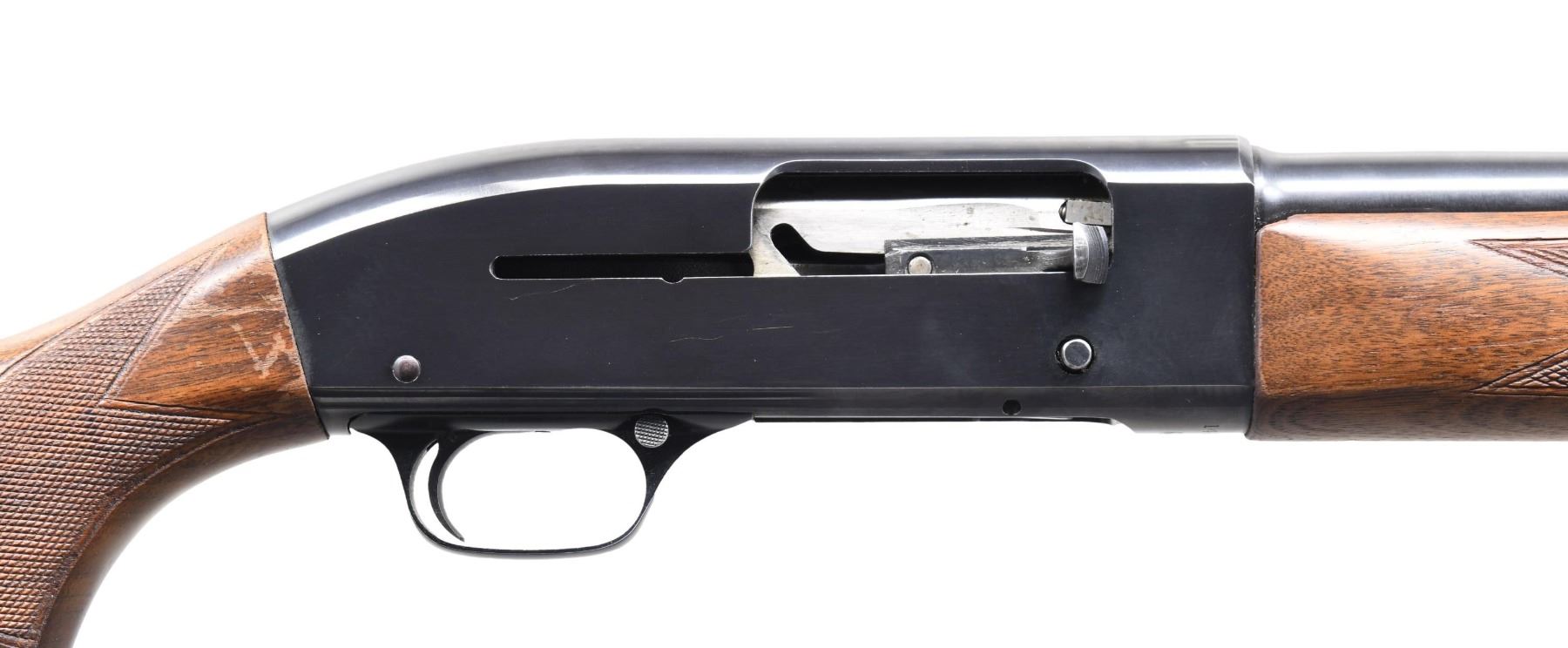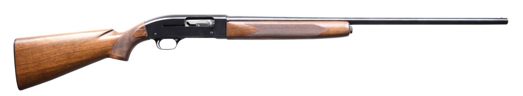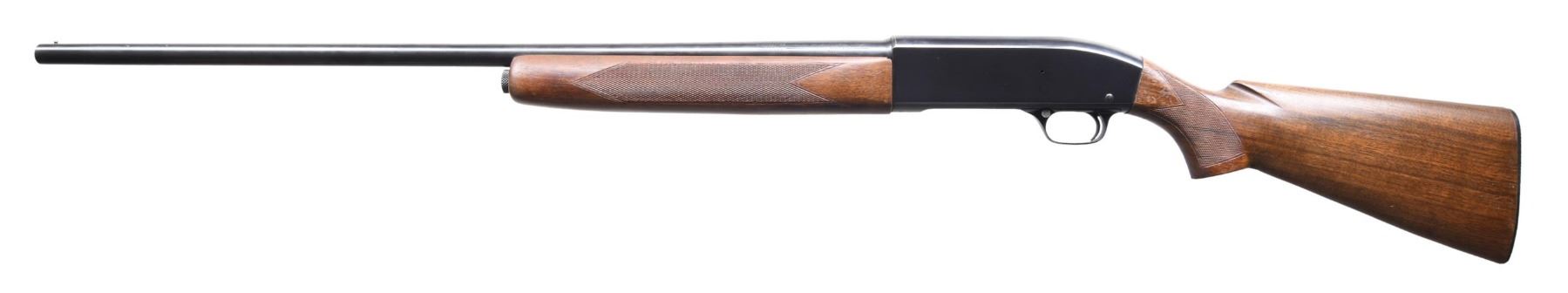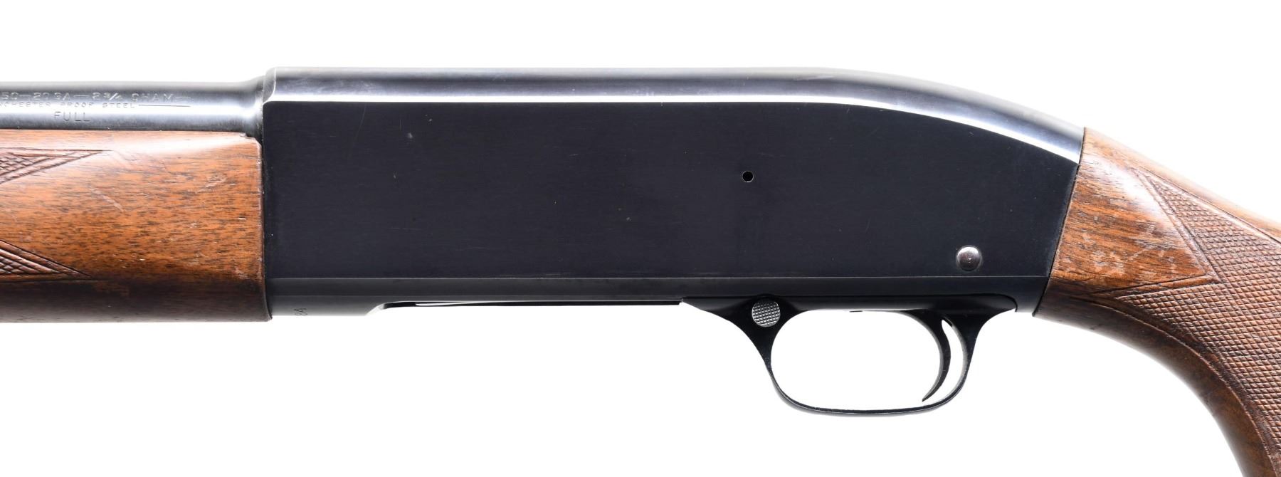 Cal. 20 GA, 2 3/4". S# 146284. Bbl. 28". Model 50 semi-automatic shotgun mfg. by Winchester circa. 1959. Left side of the bbl. is marked with the Winchester trademark logo, followed by the model and cal. designations above "FULL." Metal components exhibit a blue finish overall, save for the aluminum trigger guard, which exhibits a black anodized finish. Checkered wood pistol grip buttstock and forend. Aluminum bead front sight. CONDITION: very good, with metal components retaining the vast majority of their original factory finishes, exhibiting some light to mild edge wear, as well as some scattered superficial handling marks. Mirror bore. Wood furniture shows some scattered marks and minor impressions from handling and storage, with two small chips present on the top rear corners of the handguard. (24-3884/MLW). CURIO. $300-450.