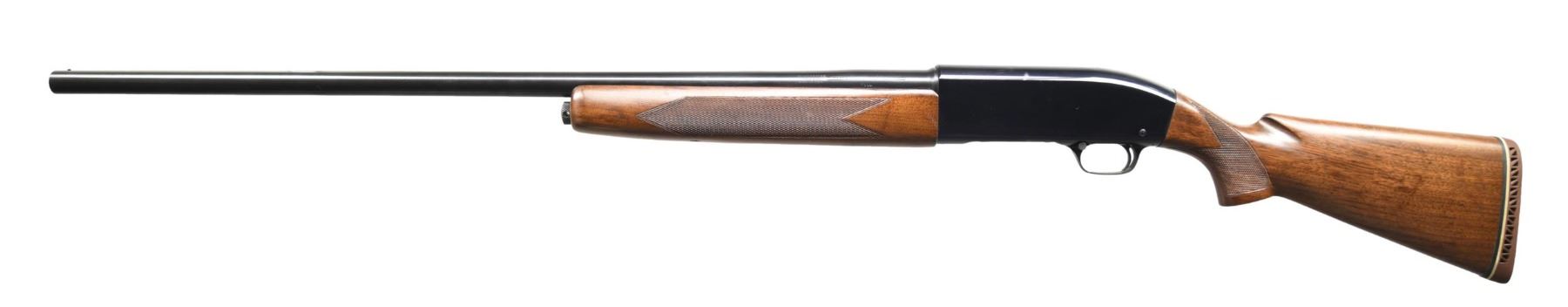 SHOTGUN. Cal. 12 ga. 2 3/4". S# 174373A. Bbl. 30", plain with fixed full choke and steel bead. Three-shot gas-operated action with alloy receiver. Forearm and pistol grip walnut stock of factory checkering. LOP: shortened to 13 3/4" over an aftermarket Pachmayr pad. CONDITION: over 97% finish shows small wear spots on action. Original wood finish shows spots of wear with scattered handling marks and small dents. Very good bore. (24-3881/DS). CURIO. $225-350.