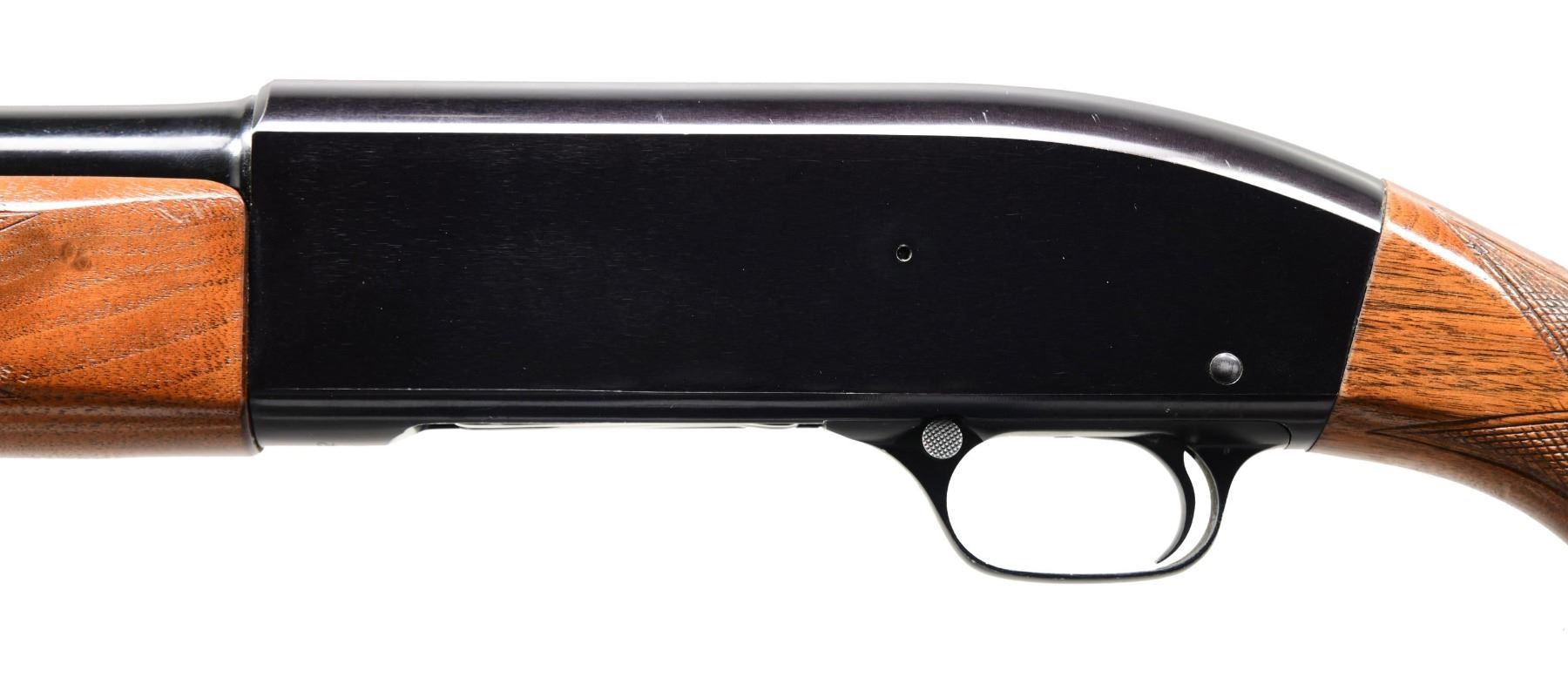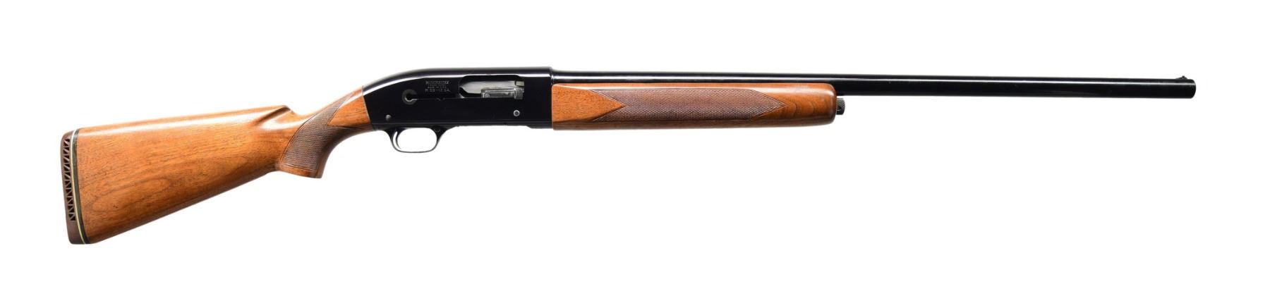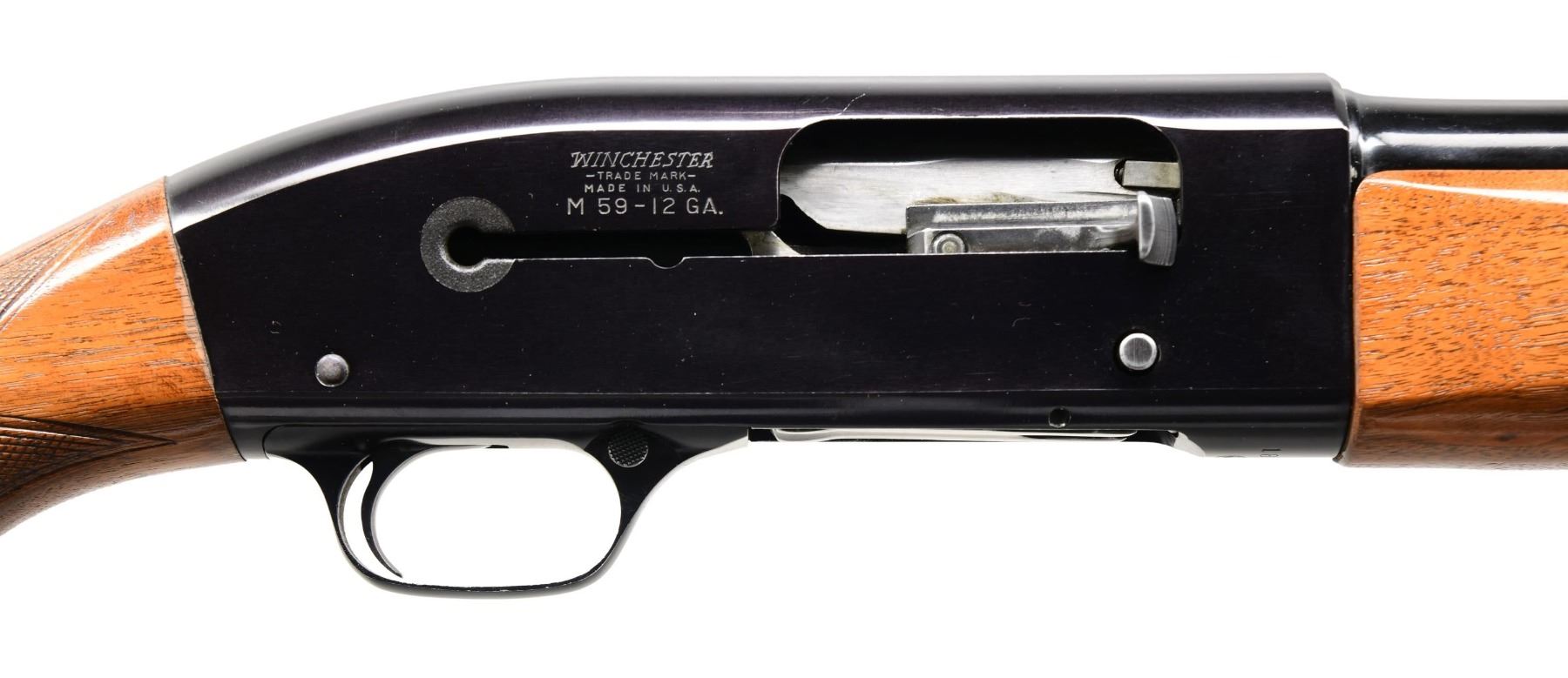 Cal. 12 GA, 2 3/4". S# 1862. Bbl. 28 1/8". Model 59 semi-automatic shotgun mfg. by Winchester circa. 1960-1965. Left side of bbl. is marked "WIN-LITE," followed by the cal. designation above "FULL." Right side of the receiver is marked with the Winchester trademark logo above "M 59 - 12 GA.". Aluminum receiver and trigger guard exhibit a black finish overall. Steel bbl. exhibits a black fiberglass exterior. Bolt is polished in-the-white. Checkered wood pistol grip buttstock and forend. CONDITION: metal components retain the vast majority of their original factory finish, exhibiting some light edge wear as well as some superficial handling marks overall. Mirror bore. Action functions appropriately when cycled by hand. Wood furniture is very good overall, exhibiting some scattered marks and minor impressions from handling and storage, with a couple small spots of adhesive present on the forend. (24-3518/MLW). CURIO. $300-400.