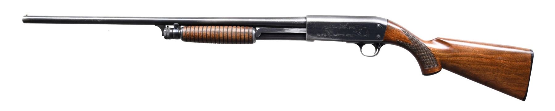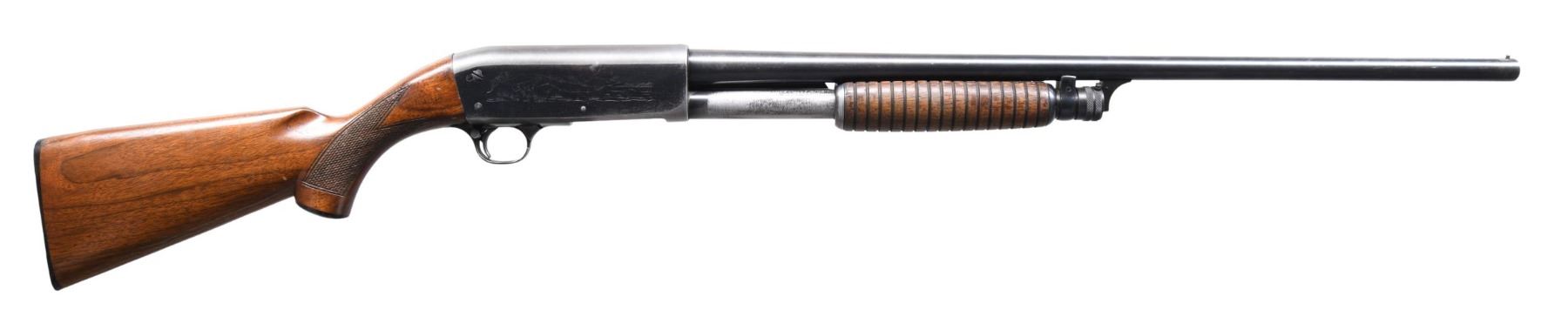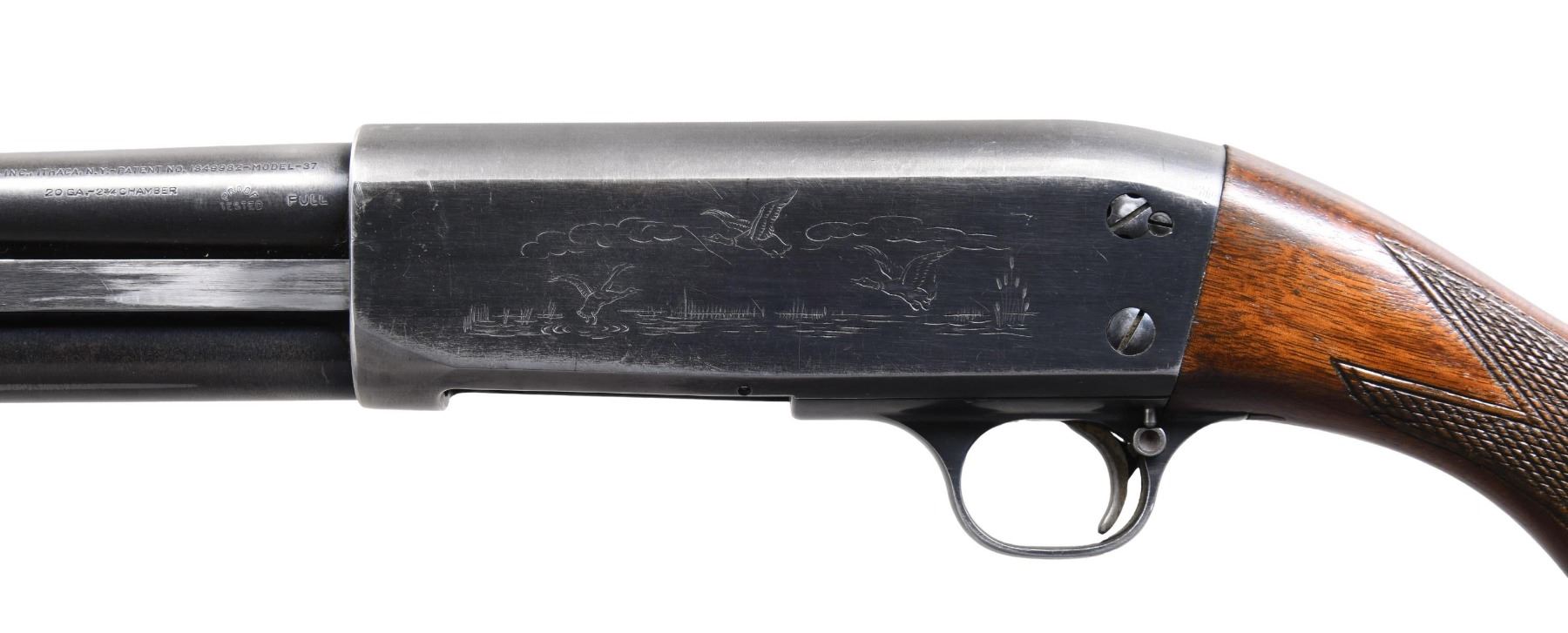 Cal. 20 GA, 2 3/4". S# 127404. Bbl. 24 3/4". Model 37 pump action shotgun mfg. by Ithaca. Left side of the bbl. is marked with Ithaca's mfg. and patent information, followed by the model designation, above the cal. designation, and "FULL". Left side of the receiver is engraved with a scene of three ducks and a scene of a hunting dog with two pheasants marked on the right. Metal components exhibit a blue finish overall. Checkered wood pistol grip buttstock with grooved wood pump. Brass bead front sight. Matching numbers are present on the receiver and bbl. CONDITION: metal components retain large amounts of their original factory blue finish, exhibiting areas of wear and thinning that show through to gray patina, as well as scattered superficial handling marks overall. Mirror bore. Wood furniture shows scattered marks and minor impressions from handling and storage, with the buttstock exhibiting chipping on the right side of the wrist and around the receiver and trigger guard tang. (24-5882/MLW). CURIO. $300-500.