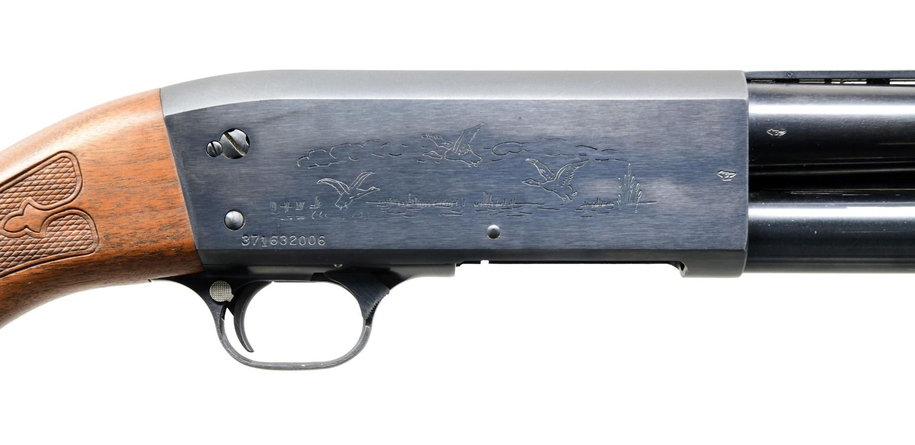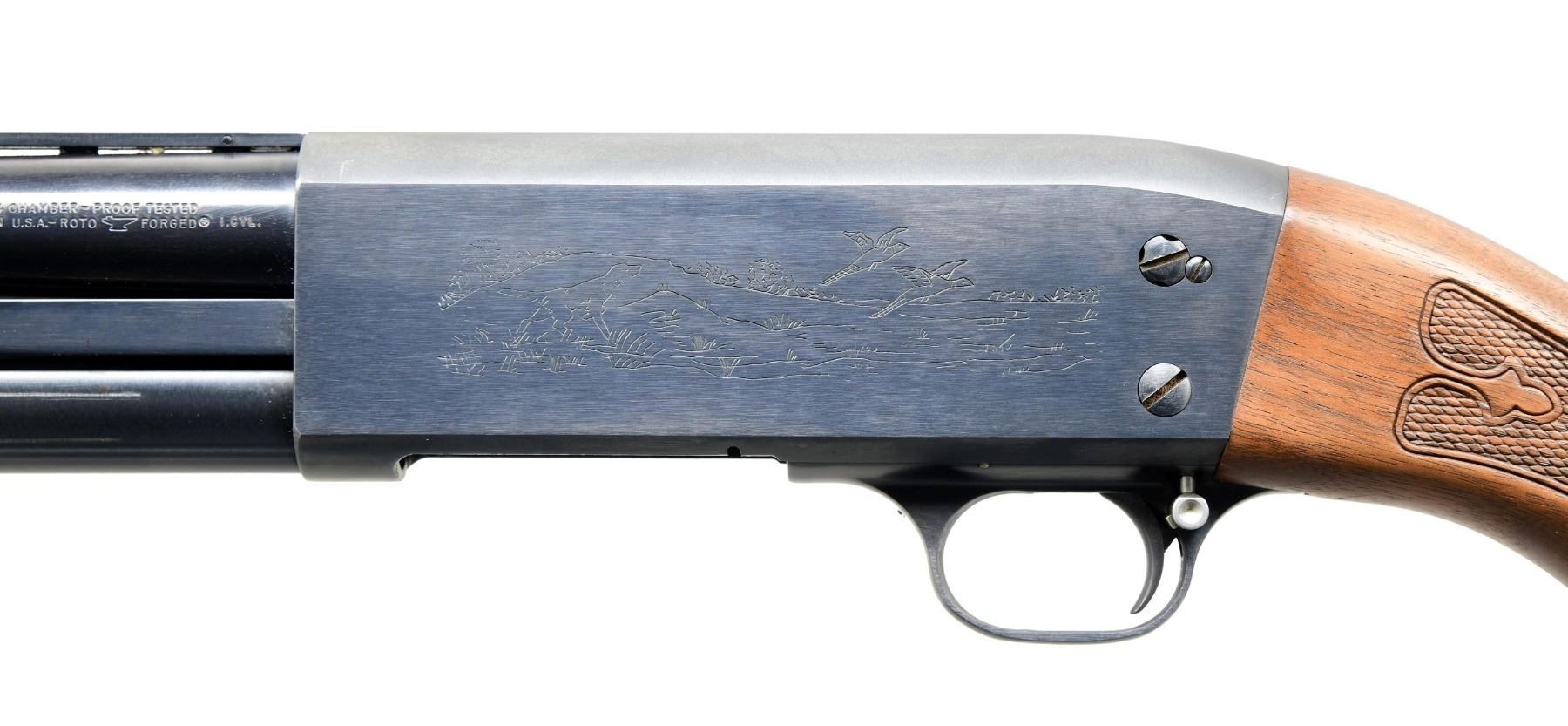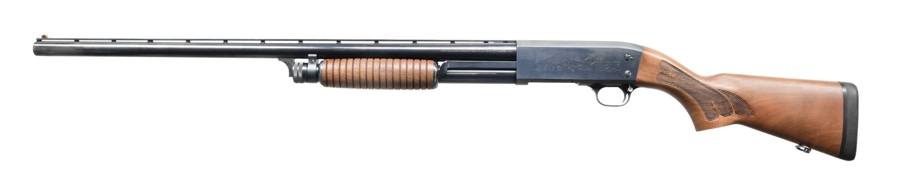 SHOTGUN. Cal. 12 GA, 2 3/4". S# 371632006. Bbl. 26 1/8". Model 37 Featherlight pump action shotgun mfg. by Ithaca Gun Co. Left side of bbl. is marked with the model and cal. designations above Ithaca's mfg. information, followed by "I. CYL." towards the breech. Sides of the receiver are lightly engraved with game scenes. Metal components exhibit a blue finish overall. Checkered wood pistol grip buttstock with grooved wood pump. Grooved matte V/R with red fiber optic front sight. CONDITION: metal components retain the vast majority of their original factory blue finish, exhibiting some light wear on the mag. tube from cycling of the action. Mirror bore. Action functions appropriately when cycled by hand. Wood furniture is excellent overall. (24-3516/MLW). MODERN. $300-500.