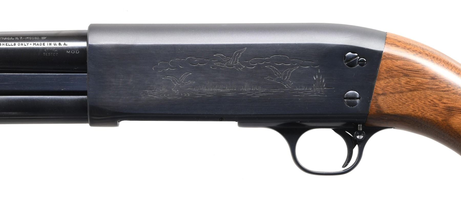 Cal. 16 ga. 2 3/4". S# 602145. Bbl. 28" w/ fixed Mod choke & Raybar front sight. Action has game scene roll engraving. Small round corrugated slide handle & plain pistol grip stock w/ original buttplate. CONDITION: over 97% reblued finish. Wood has very good satin finish. Very good, bright bore. (23-7098/DS). CURIO. $300-450.