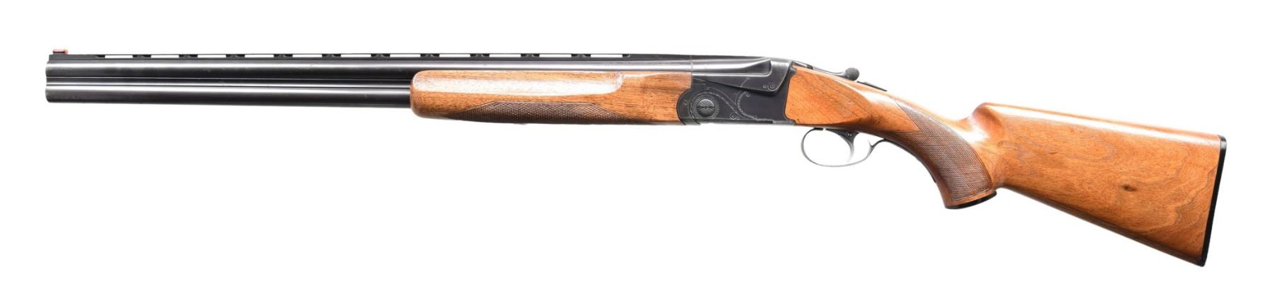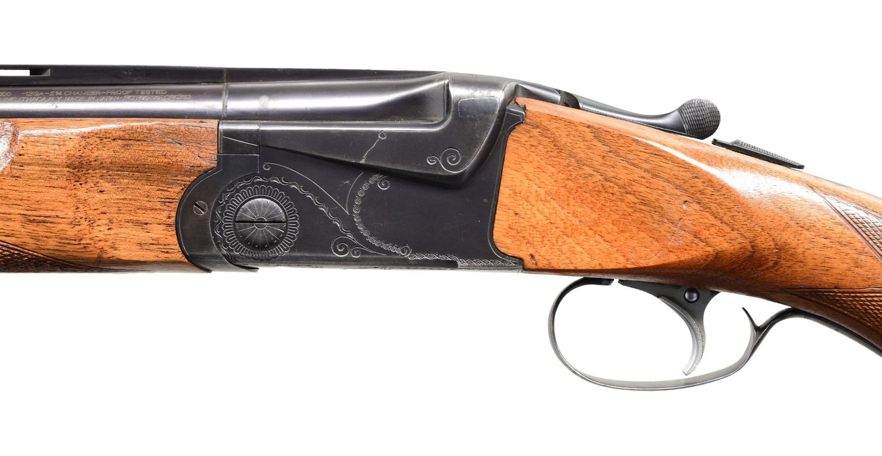 Cal. 12 GA, 2 3/4". S# 518114. Bbl. 26". Model 500 O/U shotgun mfg. in Japan by SKB and imported/retailed by Ithaca. Left side of the bbl . is marked with the model and cal. designations above Ithaca's mfg. information and "MADE IN JAPAN", with "CUSTOM CRAFTED FOR ITHACA BY SKB" marked on the right. Metal components exhibit a blue finish overall. Checkered wood pistol grip buttstock and forend. Matte V/R with red fiber optic front sight. Matching numbers are present on the receiver, bbls., and forend iron. CONDITION: metal components retain the majority of their original factory blue finish, exhibiting some wear and thinning (primarily on the receiver), with scattered handling marks and spots of light to mild surface oxidation present overall. Mirror bores. Wood furniture shows some scattered marks and impressions from handling and storage, but otherwise remains sturdy and serviceable. (24-2771/MLW). MODERN. $250-350.
