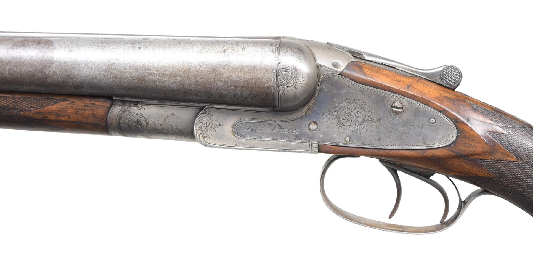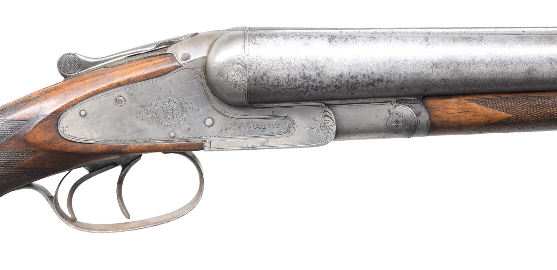 Cal. 10 Ga. 2-7/8". S# 19089 (1887?). Only about 1400 guns of this grade were made in Syracuse. This gun has 32" fine damascus barrels engraved "L.C. MAKER SYRACUSE N.Y." "STEEL DAMASCUS" on tops. Barrel flats are stamped with S# and grade which also appears on watertable. Case hardened sidelock action with rotary bolt is missing safety button and is engraved with splashes of scroll. Maker's name is on each lockplate. Trigger guard bow is engraved with portrait of spaniel retrieving quail. S# is on tang. Pistol grip buttstock of lightly marbled European walnut measures 14-1/4" over L.C. Smith "Trap Gun" buttplate. Closely spaced point pattern checkering is at grip. Matching splinter forend with inlet ebony tip has "J" spring release. MEASUREMENTS: BBLS: Bore Diameter: L .789. R .789. Restriction: L .025 (Mod). R .030 (Mod). Wall thickness: L .038. R .038. STOCK: DAH: 3". DAC: 1-7/8". CAST: neutral. LOP: 14-1/4". WEIGHT: 9 lb. 5 oz. CONDITION: fair to good. Barrels retaining a good amount of original finish with fair definition to pattern. Action and lock plates retain between 30-40% original color. Stocks with old oil refinish. Checkering considerable worn. Buttstock cracked behind lockplates and this crack extends to rear of top strap and flexes slightly. Bores are shiny but somewhat pitted. Action is tight. Top lever retaining screw stripped, right firing pin missing, as is safety button. (01-25851/MGM). ANTIQUE. $500-900.