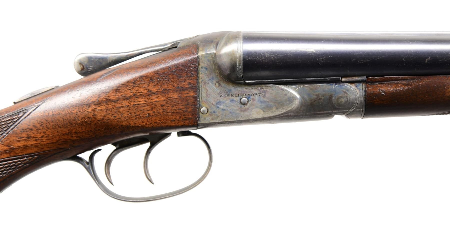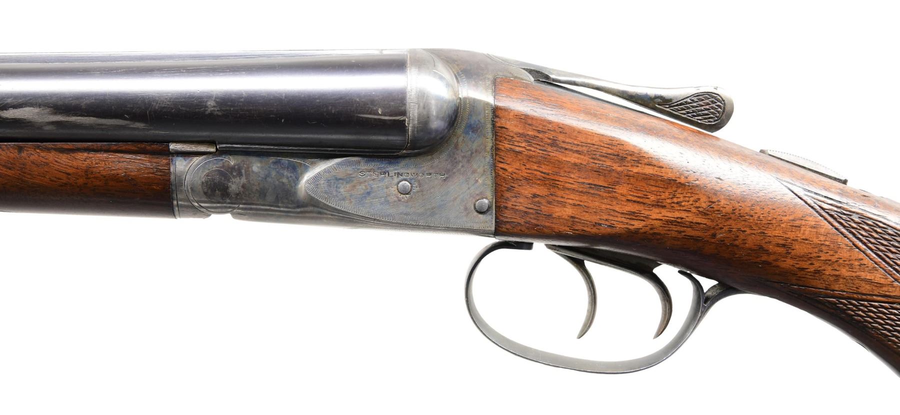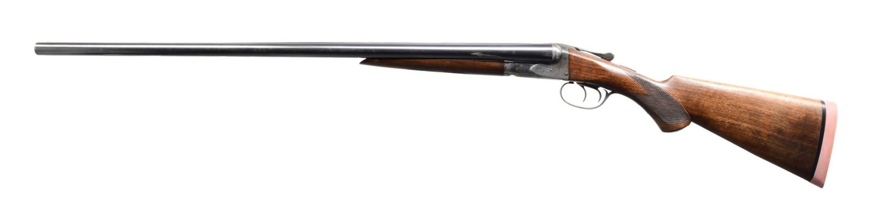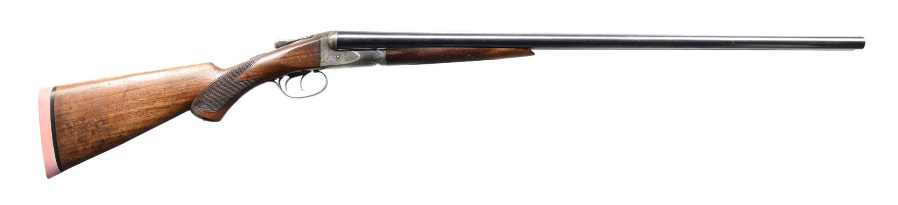 SHOTGUN. Cal. 16 Ga., 2 3/4". S# 367043 (1929). The 28" Sterlingworth compressed steel barrels have a concave matted rib having ivory front and mid beads. Fixed Full and Mod. chokes. Boxlock action with double triggers, extractors, and auto-safety. Checkered walnut stock set with splinter forearm and added black grip cap. LOP: 13 1/2" to the replacement decelerator pad. DAC: 1 3/4". DAH: 2 7/8". CONDITION: good barrel blue showing numerous marks, streaks of wear, and areas of brown patina. Fair case colors overall, with stronger colors in protected areas showing areas of silvering from wear. Lightly sanded and refinished wood has recut checkering along with light marks. Very good bore. (24-3388/MD). MODERN. $600-900.
