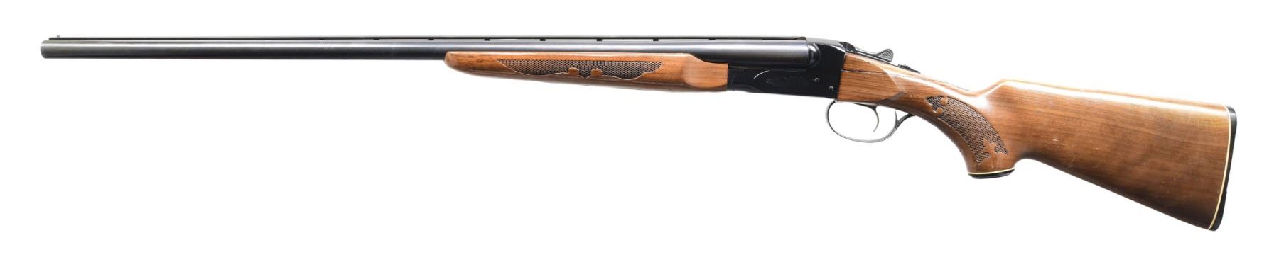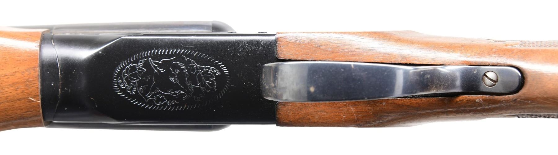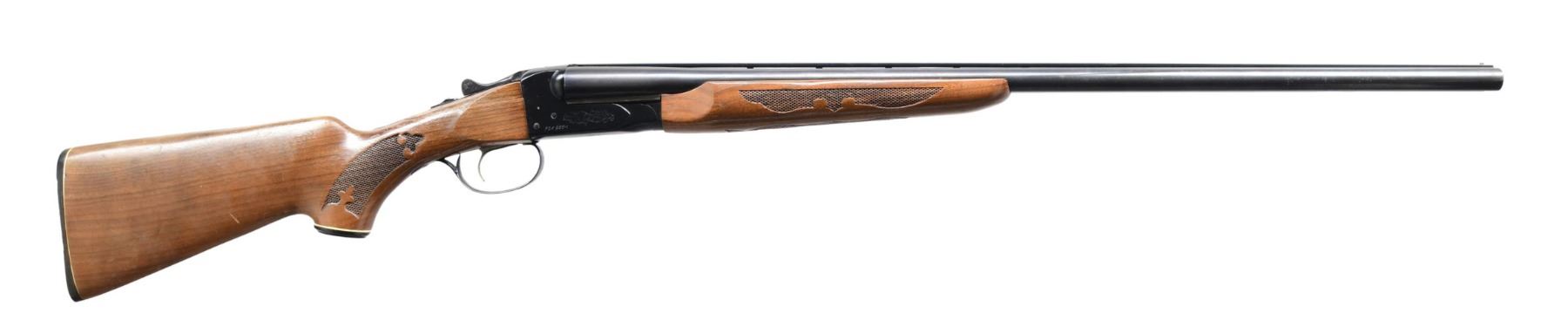 Cal. 20 Ga., 3". NSN. The 28" VR barrels have bright bead; fixed Full & Mod chokes. Satin black-finished with single trigger and ejectors. Bottom of receiver has engraved fox bust. Press-checkered walnut stock set with semi-beavertail forearm. LOP: 13.5" to buttplate. CONDITION: good metal with scattered pinprick oxidation and marks. Balance of wood has a very good finish with evidence of large repaired break in wrist. Shiny bores. (24-3893/MD). CURIO. $300-500.