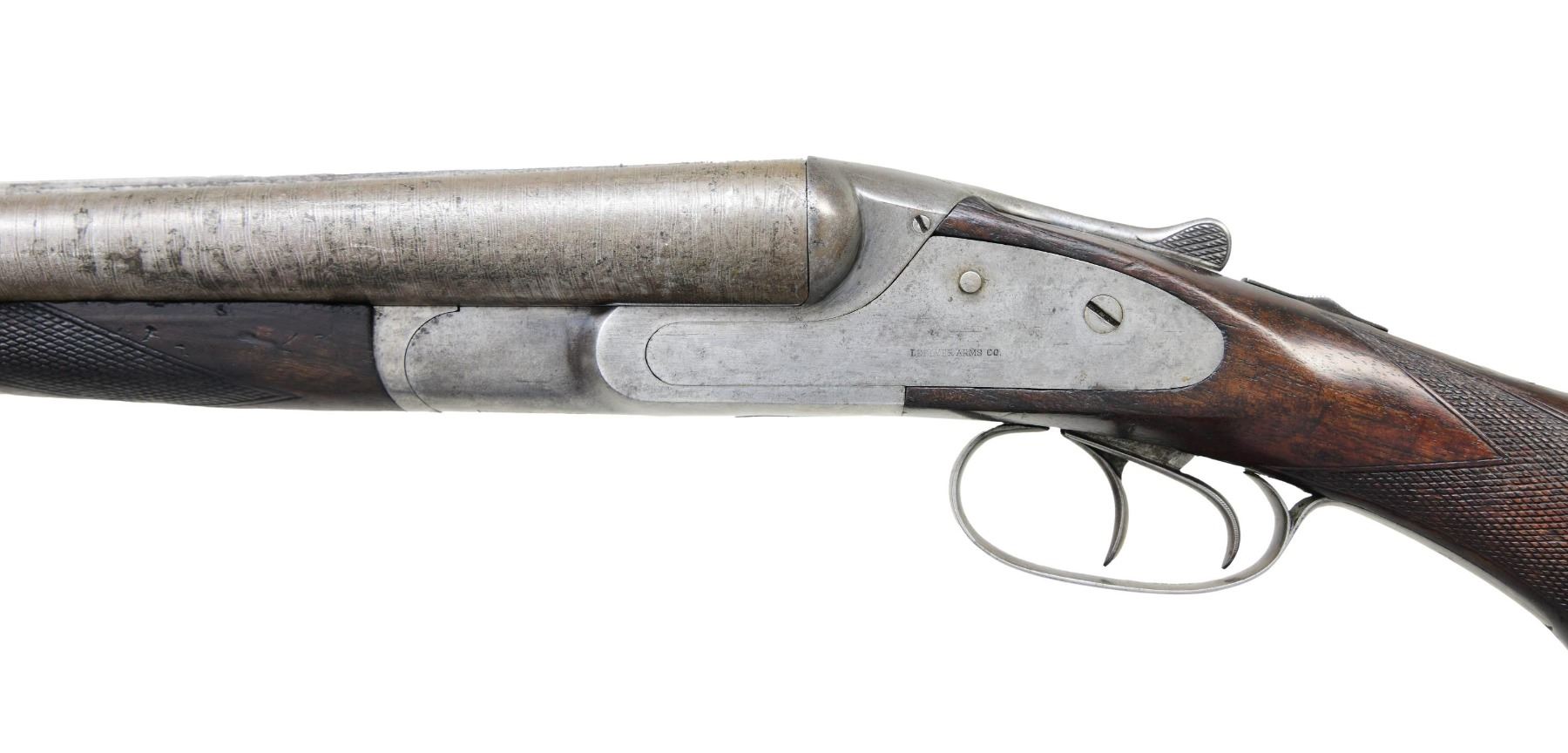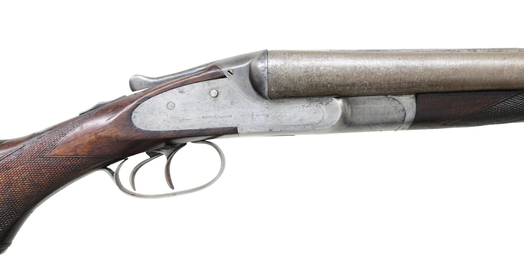 Cal. 12 Ga. 2-5/8". S# 42524. A typical production Lefever. This gun has 30" twist steel barrels with matted flat rib having dolls head rib extension. Automatic compensating action with cocking hook has automatic safety, cocking indicators and double triggers. Lockplates are marked "LEFEVER ARMS CO". Capped pistol grip buttstock of fiddle figured European walnut measures 14-1/8" over Levfever logo buttplate. Point pattern checkering is at grip. Matching splinter forend with steel tip has spring tension release. MEASUREMENTS: BBLS: Bore Diameter: L .732. R .731. Restriction: L .030 (full). R .025 (mod). Wall thickness: L .035. R .037. STOCK: DAH: 2-3/4". DAC: 1-5/8". CAST: neutral. LOP: 14-1/8". WEIGHT: 7 lb. 14 oz. CONDITION: fair to good. Metal parts show cleaning to grayish brown on barrels and silver gray on action. Stocks retain what appears to be remnants of their original finish with many deep and light mark, scratches and dings. Bores are shiny with some light scattered pitting. Mechanically good. (24-5938/MGM). CURIO. $600-900.