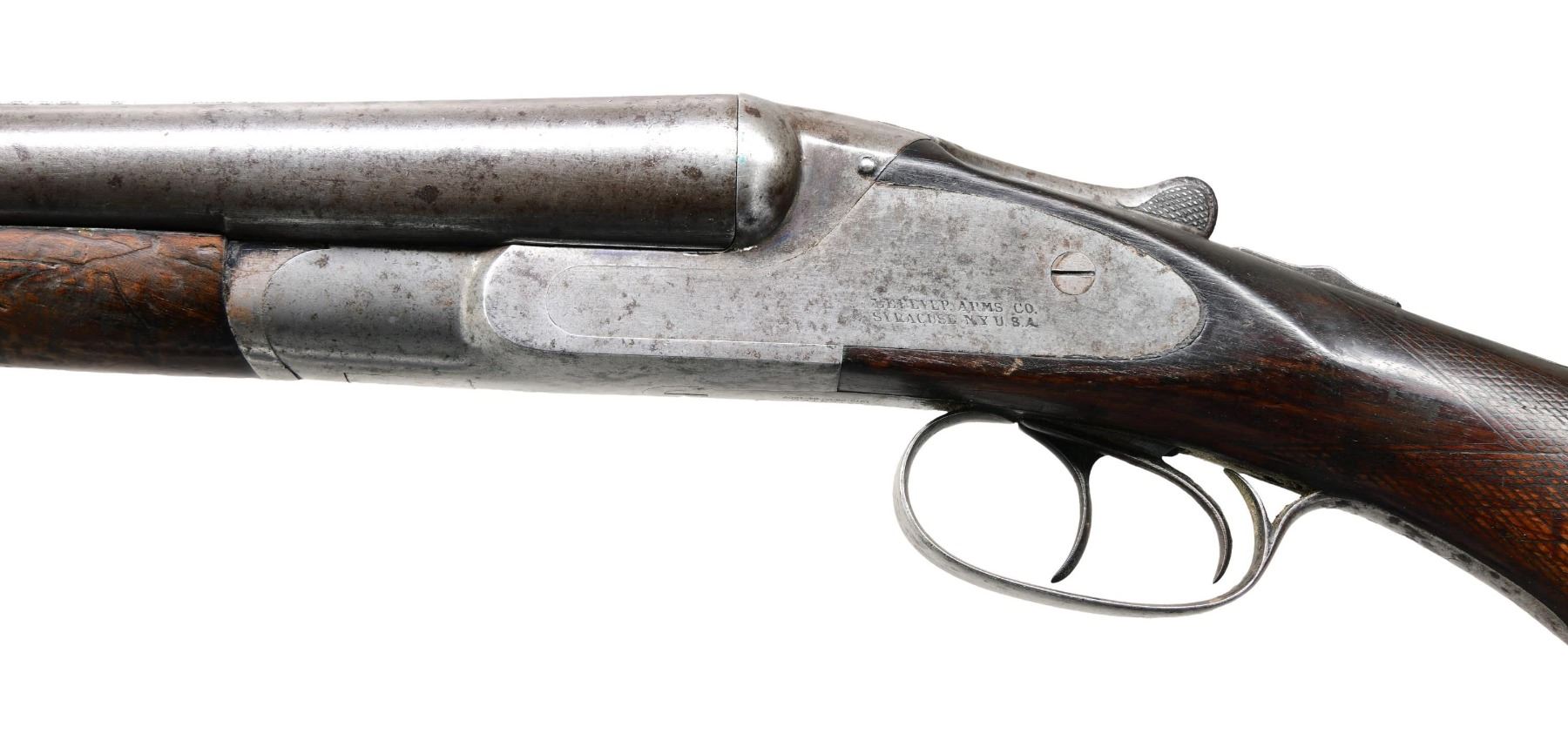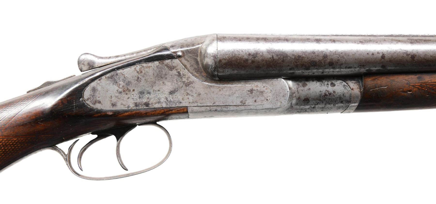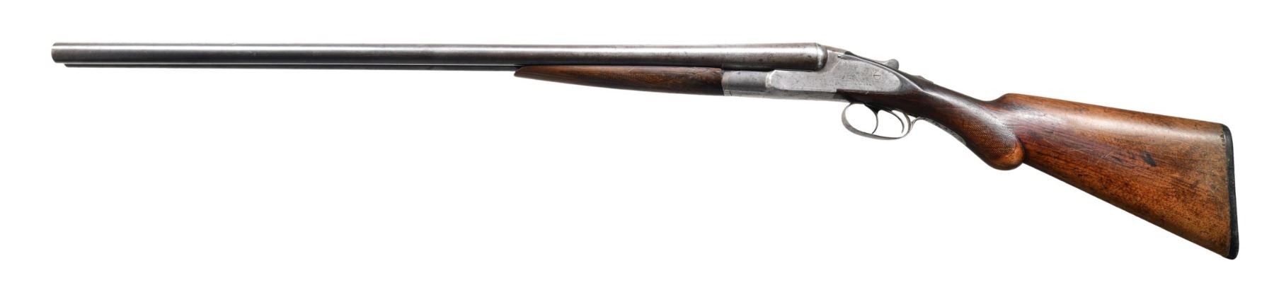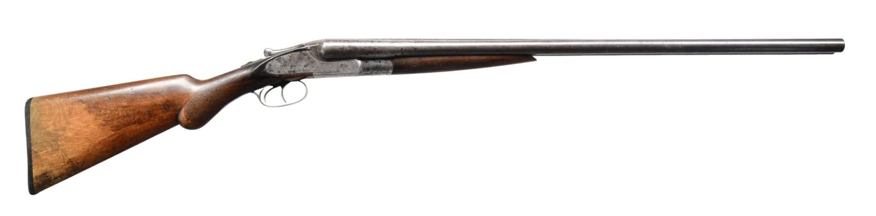 Cal.12 Ga., 2 3/4". S# 70597. Bbls. 28" with matted rib, bright bead, and full chokes. Sideplated boxlock action with address on side plates. Action features double triggers, extractors, and top tang safety. Splinter walnut forearm and round-knob pistol grip stock. LOP: 13" to worn buttplate. CONDITION: fair overall. Bbls' blue is fair, mixed with a gray/brown patina, with light pitting. Gray patina on the receiver, with traces of case colors. Fair, worn stock with smooth checkering, numerous marks, and small, scattered cracks. Fair bores showing shine, dents, and fouling. (24-2584/MD). CURIO. $350-500.