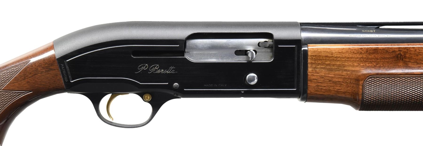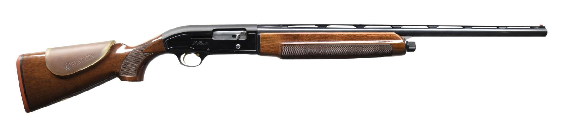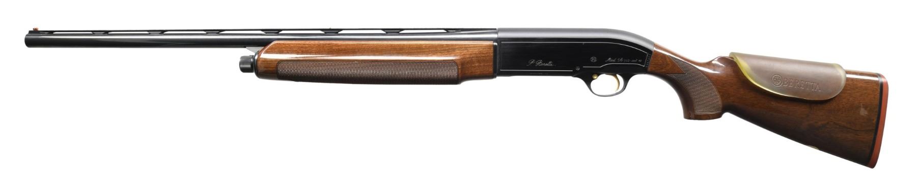 Cal. 12 ga. 2 3/4". S# N84798E. Bbl. 26" vent rib with fixed Skeet choke. Red fiber optic front sight with steel mid bead. Alloy action with gold-finished trigger and safety. Forearm and pistol grip stock of gloss-finished walnut with cut checkering. Stock has an oval nameplate in toeline with added Beretta rubber comb extension. LOP: 14 1/2" over an aftermarket thin red pad. CONDITION: over 98% wood and metal finish. Bore is generally bright with dark spots in the gas port area. (24-3987/DS). MODERN. $400-600.