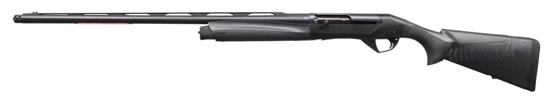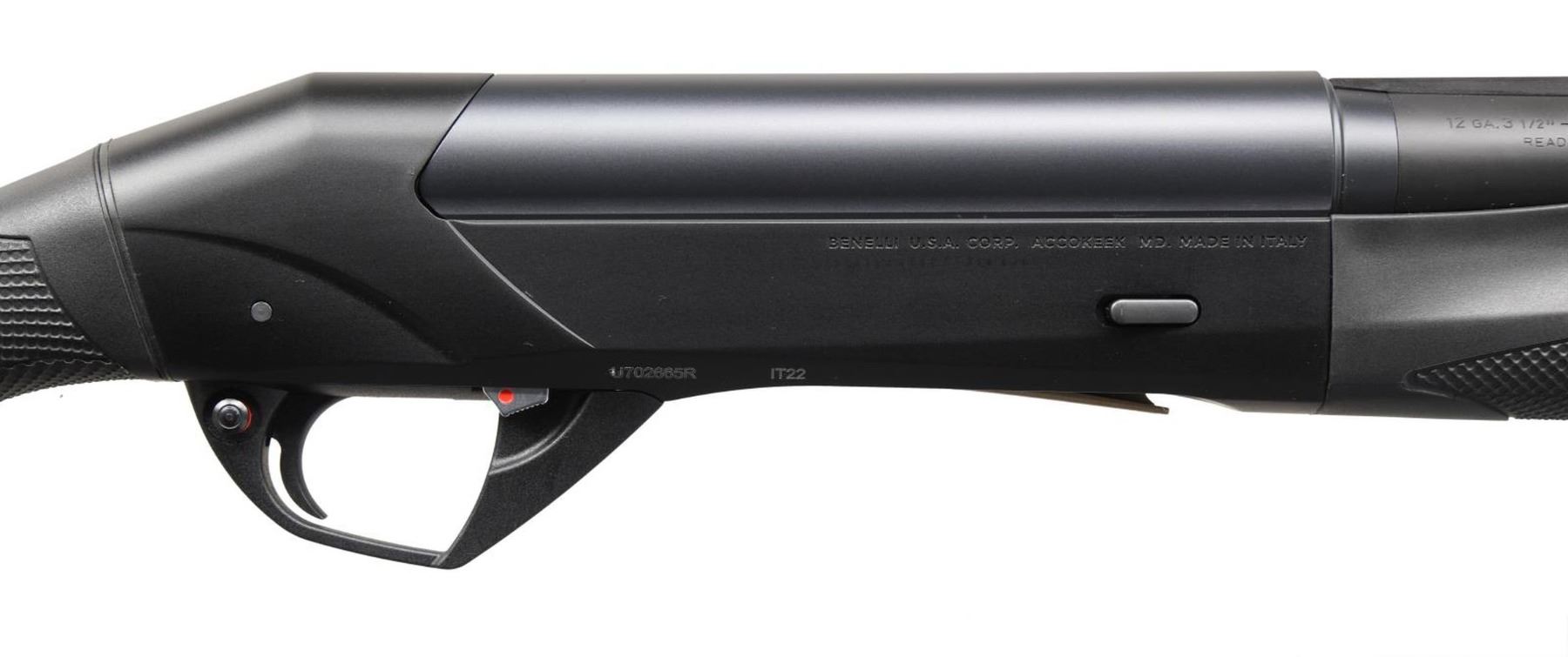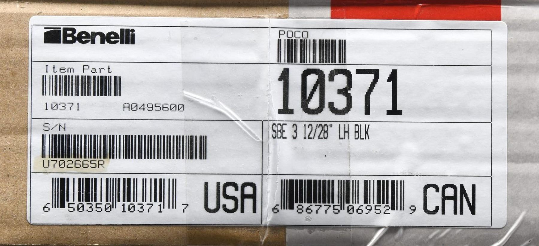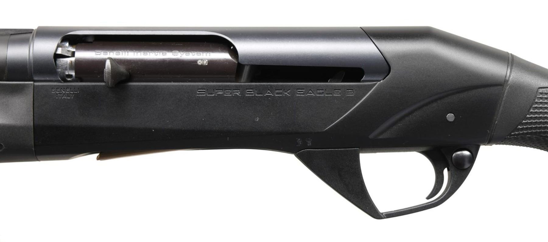 AUTOMATIC SHOTGUN WITH MATCHING FACTORY BOX. Cal. 12 Ga., 2 3/4". 3", 3 1/2". S# U702665R. Bbl. 27 5/8". Left handed Super Black Eagle III semi-automatic shotgun mfg. by Benelli in Italy and imported by Benelli USA Corp. Left side of bbl. is marked "CRIOBARREL" above Benelli's mfg. information, with the cal. designation on the right. Left side of receiver exhibits the model designation, with Benneli USA Corp.'s importer information on the right. Black anodized aluminum receiver, with matte blued bbl. Black polymer pistol grip buttstock and forend. Vent rib with red fiber optic front sight and Modified choke. UNATTACHED ACCESSORIES: matching factory box containing factory hard case. CONDITION: near new, with metal components retaining virtually all of their original factory finishes overall. Mirror bore. Black polymer furniture is excellent. Box shows some mild exterior wear from storage and handling, but otherwise remains sturdy and serviceable. PROVENANCE: The Collection of Gun Sport Ltd owned by Jon R. Thomas. (23-3244/MLW). MODERN. $1,000-1,500.