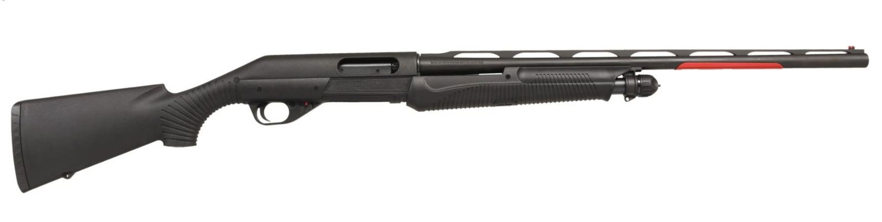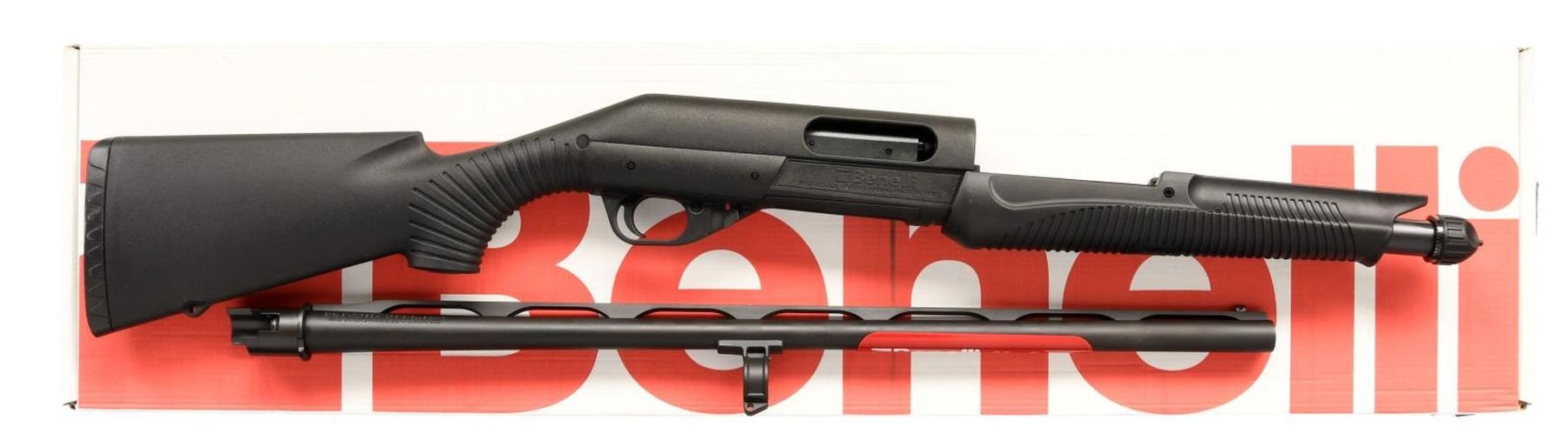 FACTORY BOX. Cal. 20 GA, 2 3/4", and 3". S# BA104512X. Bbl. 24". Nova pump action shotgun mfg. by Benelli in Italy and imported by Benelli USA Corp. Left side of bbl. exhibits Benelli's mfg. information, with the cal. designation marked on the right. Left side of the receiver exhibits the model designation and Benelli USA Corp.'s importer information. Black polymer receiver and grooved pump, with matte blued bbl. Vent rib with red fiber optic front sight and Improved Cylinder choke. UNATTACHED ACCESSORIES: matching factory box. CONDITION: near new, with the bbl. retaining virtually all of its original factory finish overall. Mirror bore. Polymer receiver and furniture are excellent overall. Box shows some mild exterior wear from storage and handling, but otherwise remains sturdy and serviceable. PROVENANCE: the collection of Gun Sport Ltd., owned by Jon R. Thomas. (23-3426/MLW). MODERN. $300-450.