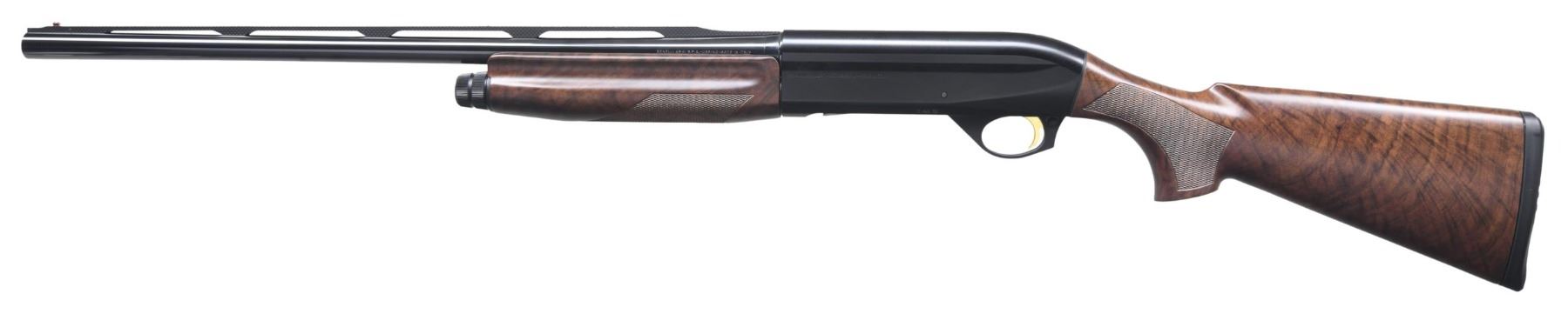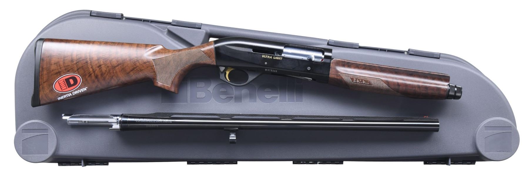 SHOTGUN WITH CASE & MATCHING FACTORY BOX. Cal. 12 GA, 2 3/4" and 3". S# M678348. Bbl. 24 1/2". Ultra Light semi-automatic shotgun mfg. in Italy by Benelli and imported by Benelli U.S.A. Corp. Left side of bbl. is marked with Benelli's mfg. information, with the cal. designation marked on the right. Left side of the receiver is marked with Benelli's importer information and Italian proofs, with "ULTRA LIGHT" marked on the right in gold characters. Receiver and bbl. exhibit a boxed "CC" date code. Aluminum receiver exhibits a black anodized finish, with the bbl. exhibiting a blue finish. Checkered wood pistol grip buttstock and forend. Carbon fiber V/R with red fiber optic front sight. Bbl. features threaded chokes and is currently fitted with an Improved Cyl. choke. UNATTACHED ACCESSORIES: matching factory box containing a factory hard case as well as factory paperwork and chokes. CONDITION: near new, with metal components retaining virtually all of their original factory finishes overall. Mirror bore. Wood furniture is excellent overall. Box exhibits some exterior wear from handling and storage but otherwise remains sturdy and serviceable. (24-3642/MLW). MODERN. $500-700.