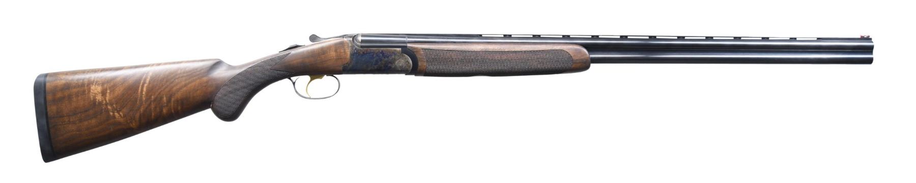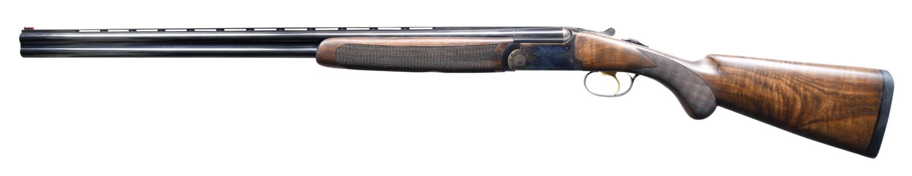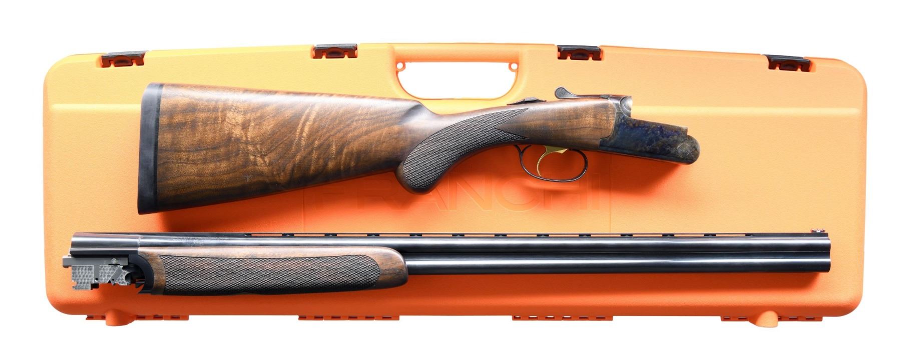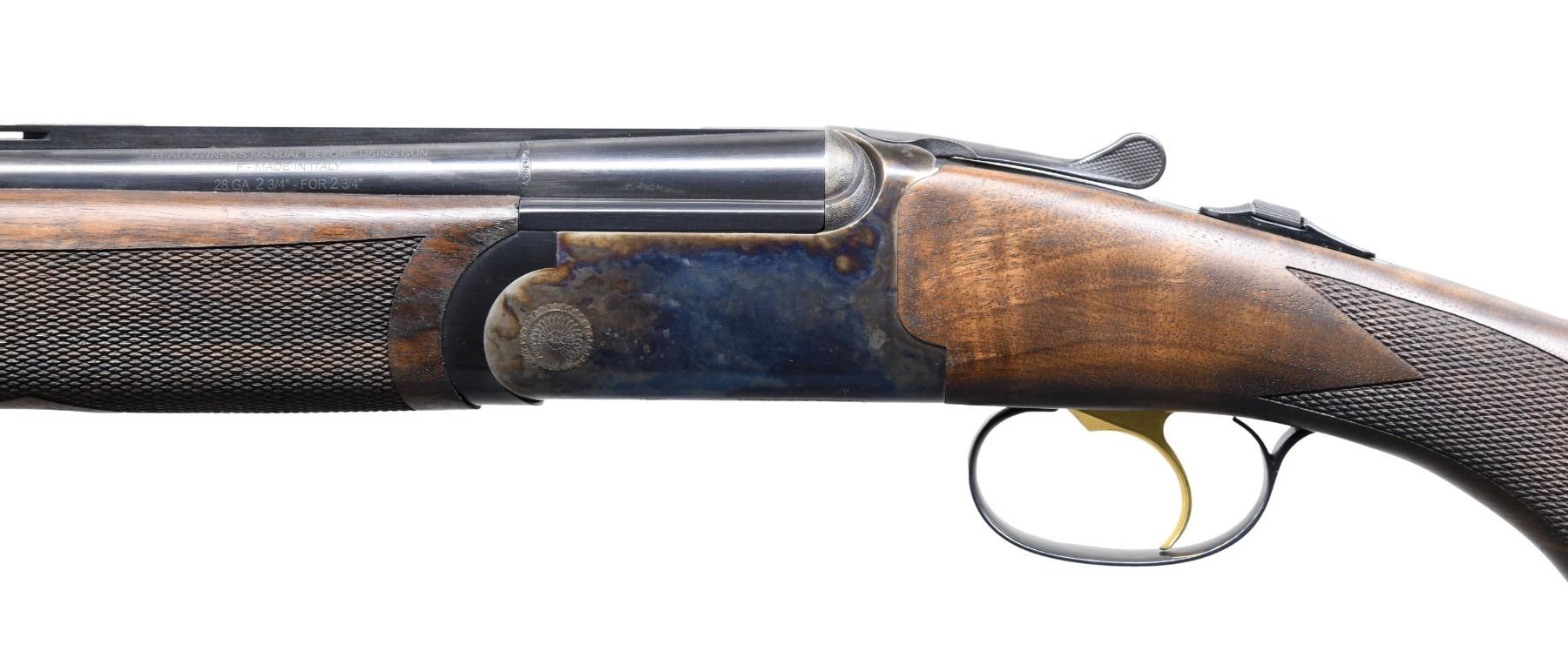 Cal. 28 Ga., 2 3/4". S# FF000151 (CL = 2013). The 28" VR barrels have fiber optic front sight. Fitted for interchangeable choke tubes; Mod, IC, and Full included. Round-bodied case hardened action with gold-plated SST, auto-ejectors, and a top tang selector. Checkered satin-finished walnut stock set; beavertail forearm and round knob pistol grip stock. LOP: 14 3/4" to buttpad. UNATTACHED ACCESSORIES: Franchi orange hard case containing paperwork, choke tube, and choke wrench. Case comes with shipping box. CONDITION: near excellent metal and wood finish, including bore. (24-2790/MD). MODERN. $1,000-1,500.