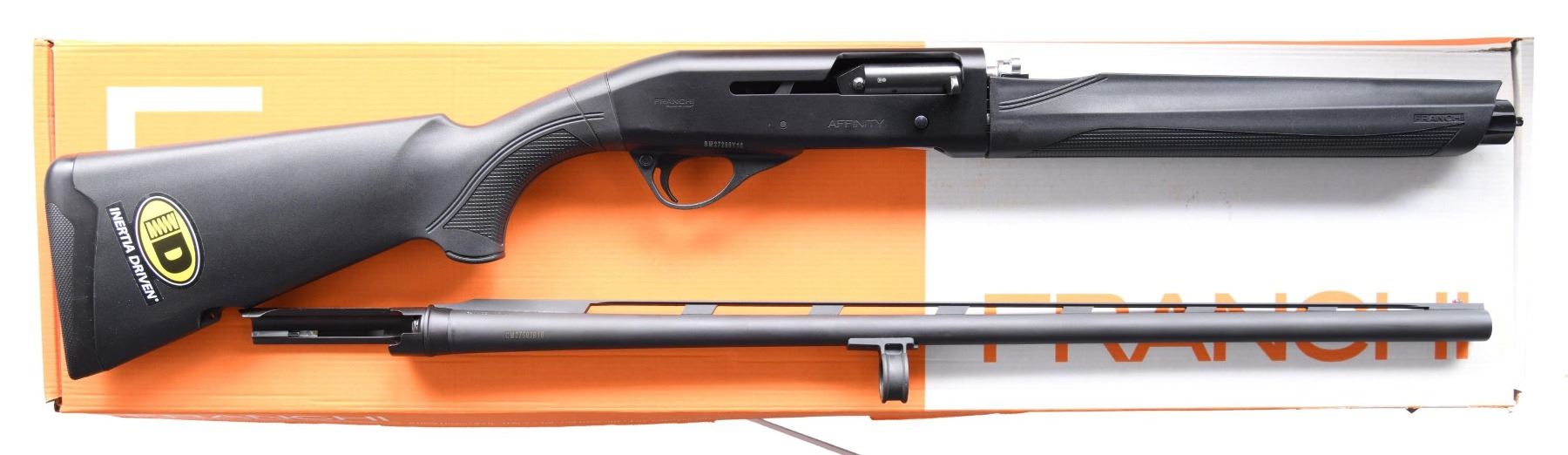 SHOTGUN WITH MATCHING FACTORY BOX. Cal. 20 GA, 2 3/4" or 3". S# BM27298Y16. Bbl. 25 5/8". Affinity semi-automatic shotgun mfg. in Italy by Franchi and imported by Benelli U.S.A. Corp. Left side of the bbl. is marked with the cal. designation, with "F-MADE IN ITALY" marked on the right. Left side of the receiver is marked with Benelli's importer information, with "FRANCHI/ MADE IN ITALY", "AFFINITY", and the S# marked on the right. Aluminum receiver exhibits a matte black finish, with the steel bbl. exhibiting a matte blue finish. Textured black polymer pistol grip buttstock and forend. V/R with red fiber optic front sight. Bbl. is fitted with a threaded Modified choke. UNATTACHED ACCESSORIES: matching factory box containing a Carlson's Modified choke. CONDITION: excellent, with metal components retaining bountiful amounts of their original factory finishes overall, save for some light wear that is present on the underside of the bbl. Mirror bore, exhibiting a few scattered spots of what appears to be grease. Action functions appropriately when cycled by hand. Polymer furniture is excellent overall. Box exhibits light to mild exterior wear but otherwise remains sturdy and serviceable. (24-3028/MLW). MODERN. $500-800.