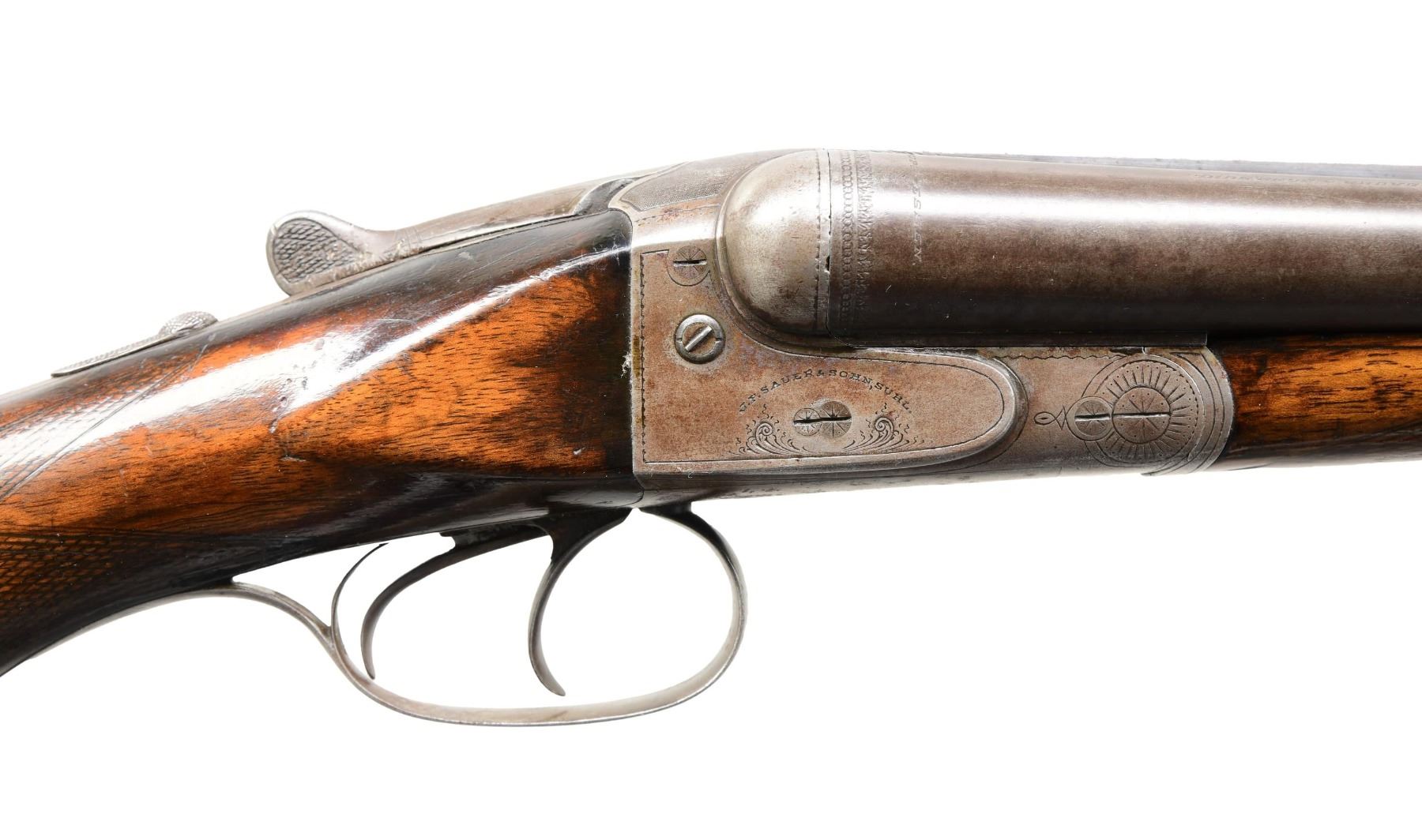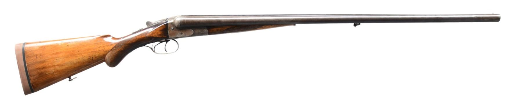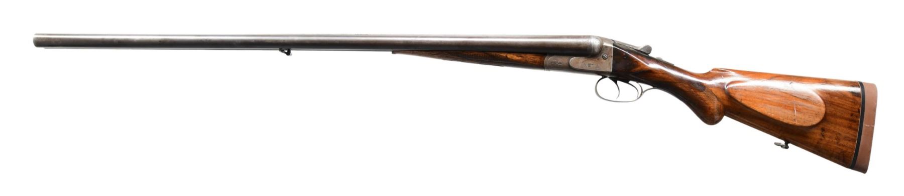 SHOTGUN. Cal. 12 Ga., 2 1/2". S# 194032. Bbls. 29 1/2", having a concave matte rib with brass bead; sling swivel on bottom rib. Fixed Mod & Full chokes. Water tables have Ulm East German Nitro proofs; barrels have matching numbers. Boxlock action featuring Greener crossbolt with rib extension, cocking indicators, double triggers, extractors, and auto-safety. Walnut stock set with splinter forearm, round knob pistol grip, toeline sling swivel, and left side cheekpiece. Buttstock has been cut to have LOP of 13 1/4" over Decelerator pad. DAC: 1 3/8". DAH: 2". CONDITION: fair barrel blue mixed with brown and gray patina, with scattered pinprick oxidation and marks. Receiver has a brown/gray patina. Heavily sanded and refinished wood shows marks and small cracks. Fair bore shows pitting. Barrels appear tight on the face. (24-3161/MD). MODERN. $200-400.