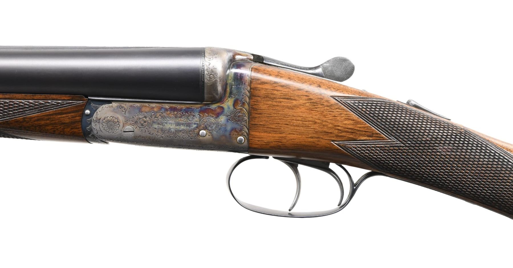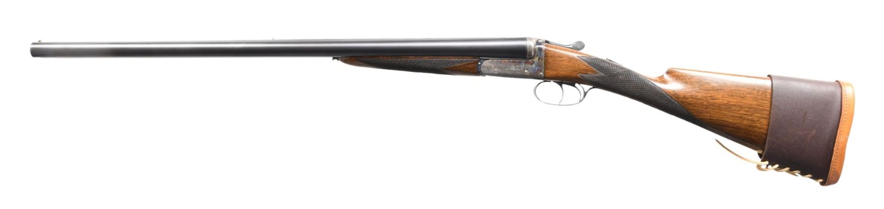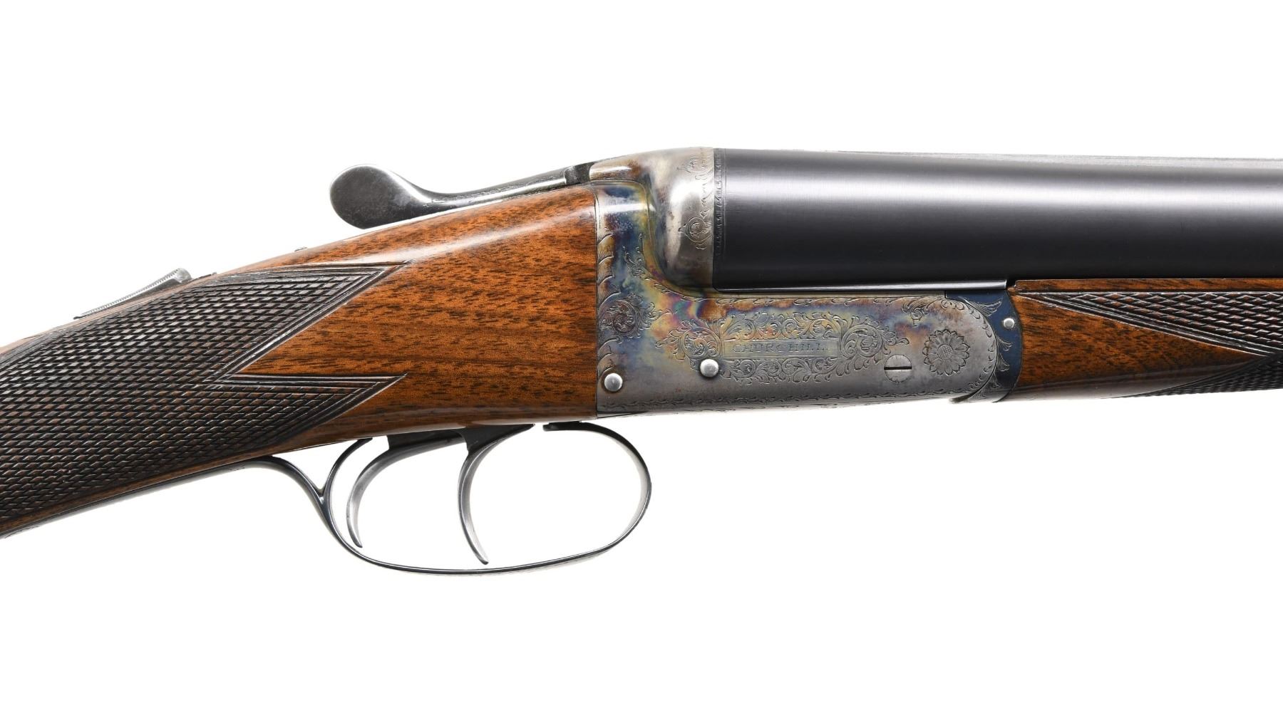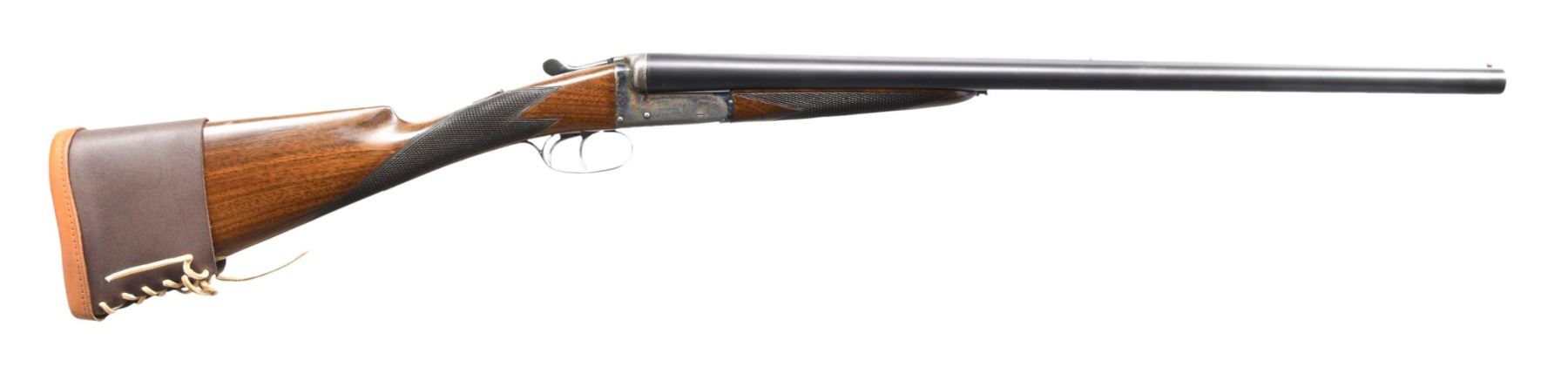 SHOTGUN. Cal. 12 Ga. 2-3/4". S# 8359 (1972). The 25" dovetailed barrels are marked "XXV" at rear of matted Churchill rib. Maker's name and address are engraved on tops. Barrel flats are stamped with Birmingham nitro proofs for 2-3/4" chambers. S#'s are engraved on bottom of barrels. Case hardened boxlock action features automatic safety and double triggers. Top lever, floor plate and trigger guard are blued. Action is engraved with sprays of scroll and has maker's name on each side. Floor plate is engraved with a Regal crown. S# is on trigger guard tang. Lightly figured Eurpoean walnut straight grip buttstock measures 14-3/8" over checkered wood butt, which is also fitted with a laced on leather pad. Flat top point pattern checkering is at grip. Matching splinter ejector forend has Anson release. MEASUREMENTS: BBLS: Bore Diameter: L .728. R .728. Restriction: L .017 (MOD). R .005 (IC). Wall thickness: L .032. R .028. STOCK: DAH: 2-5/8". DAC: 1-5/8". CAST: slightly off. LOP: 14-3/8". WEIGHT: 6 lb. 5 oz. (without pad). CONDITION: very fine; partially refinished. Barrels retaining nearly all of a later imersion blue (barrels still ring well). Action retains 60-70% case hardening color. Blued parts retain about 90% of their blue. Stocks retain nearly all of their original oil finish with a few scattered marks. Bores are bright and shiny without any noted problems. Mechanically good. Ejectors strong and in time. (24-4576/MGM). CURIO. $1,000-1,800.
