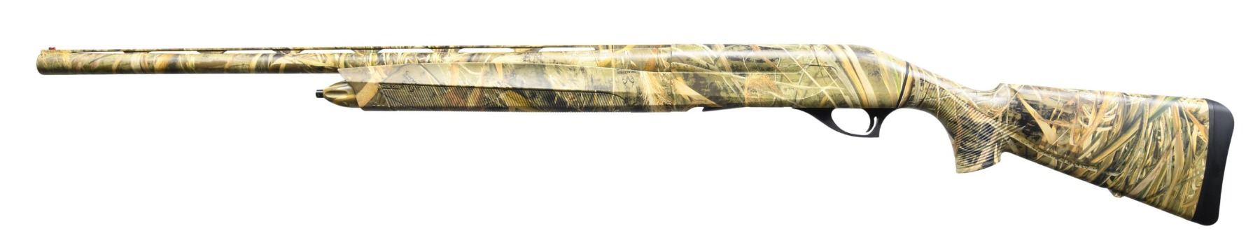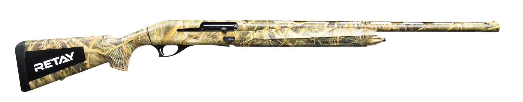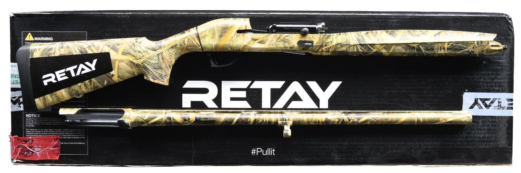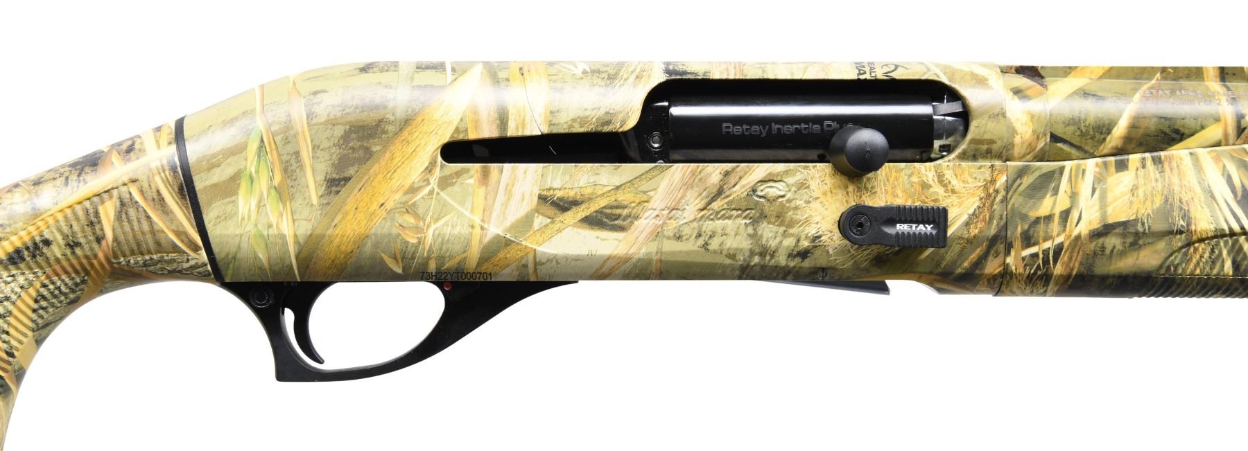 MATCHING BOX AND FACTORY HARD CASE. Cal. 12 GA, 2 3/4", 3", 3 1/2". S# 73H22YT000701. Bbl. 26". Masai Mara semi-automatic shotgun mfg. in Turkey by Retay Arms and imported by Retay USA. Left side of bbl. is marked with Retay's importer information, with Retay's mfg. information and the cal. designation marked on the right. Right side of receiver is marked with the model designation and the S#. Aluminum receiver, steel bbl., as well as the grooved pistol grip polymer buttstock and forend exhibit Realtree's MAX-5 camouflage finish. Aluminum trigger guard exhibits a matte black finish. Matte V/R with red fiber optic front sight. Bbl. is fitted with a threaded Modified choke. UNATTACHED ACCESSORIES: matching box containing a factory hard case and chokes. CONDITION: near new, with the exterior retaining virtually all of its original factory Realtree MAX-5 camouflage finish overall. Mirror bore. Box exhibits mild exterior wear from handling and storage but otherwise remains sturdy and serviceable. (24-3468/MLW). MODERN. $800-1,200.