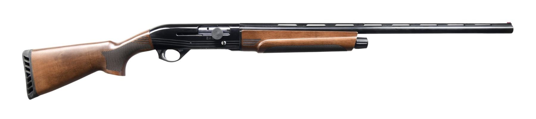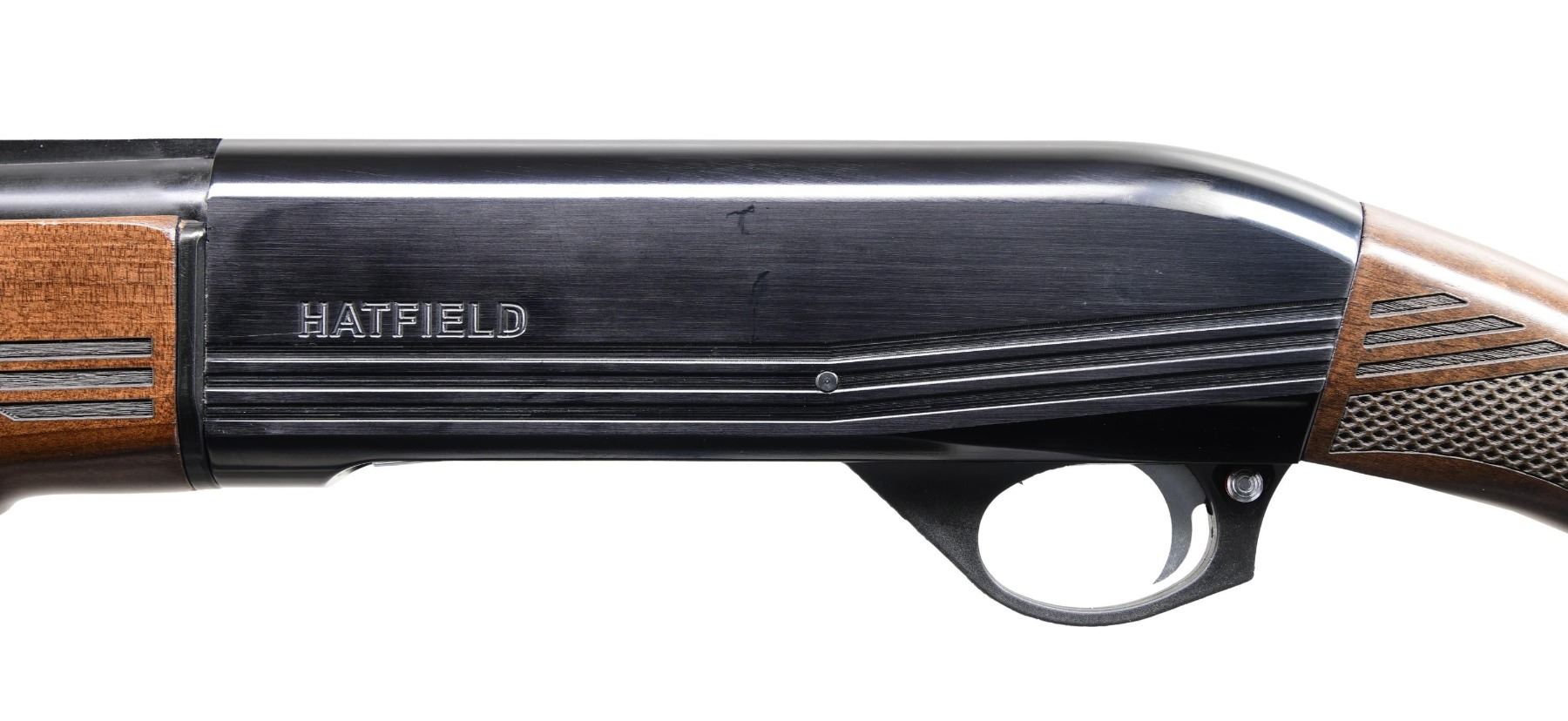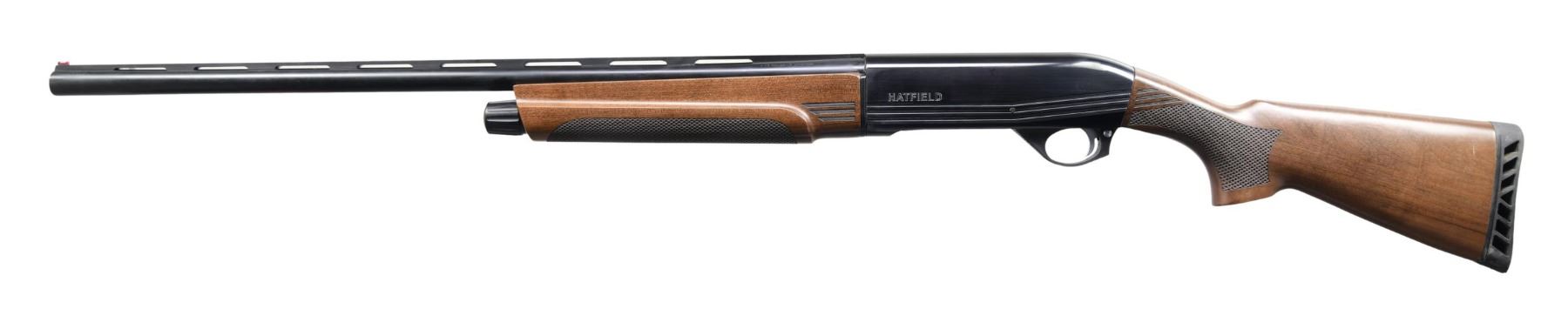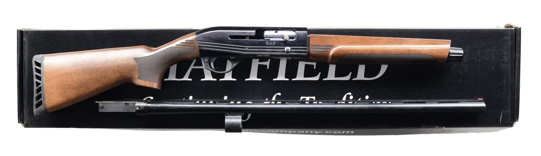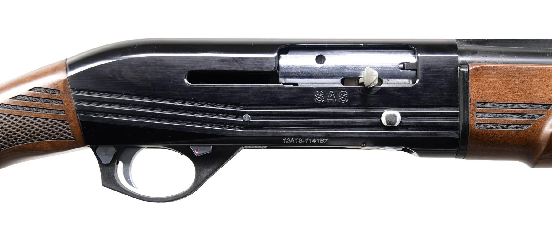 WITH MATCHING BOX. Cal. 12 GA, 3". S# 12A16-114187. Bbl. 28". SAS semi-automatic shotgun mfg. in Turkey, imported by UTAS USA, and retailed by Hatfield Gun Company. Left side of bbl. is marked with the cal. designation, with UTAS USA's importer information above "Made in Turkey" on the right. Left side of the receiver is marked "HATFIELD", with "SAS" and the S# marked on the right. Aluminum receiver exhibits a black anodized finish, with the steel bbl. exhibiting a blue finish overall. Textured wood pistol grip buttstock and forend, with black polymer trigger guard. Matte V/R with red fiber optic front sight. Bbl. is fitted with a threaded Modified choke. UNATTACHED ACCESSORIES: matching retailer box. CONDITION: excellent, with metal components retaining bountiful amounts of their original factory finishes overall, save for some superficial handling marks that are present on the left side of the receiver. Mirror bore. Action functions appropriately when cycled by hand. Wood furniture shows a few minor superficial handling marks, but otherwise is excellent overall. Box shows some light to mild exterior wear but otherwise remains sturdy and serviceable. (24-2749/MLW). MODERN. $300-500.