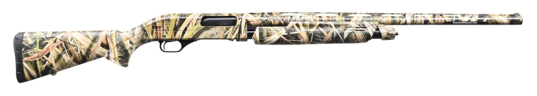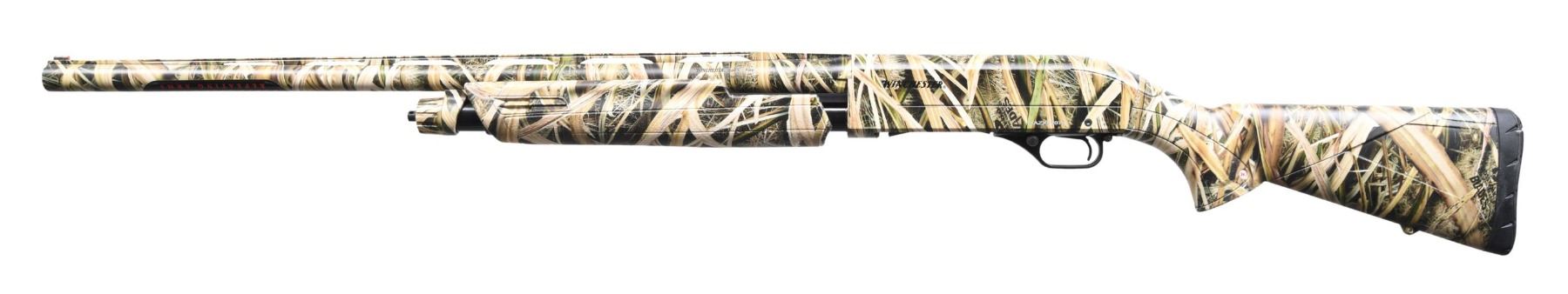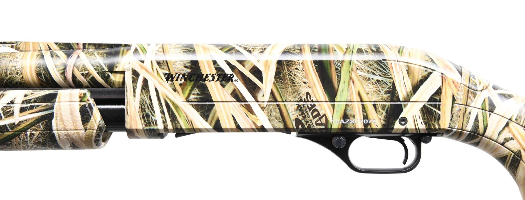 SHOTGUN WITH MATCHING BOX. Cal. 12 GA, 2 3/4". 3", and 3 1/2". S# 12AZX07078. Bbl. 26 3/8". MODEL SXP (Super X Pump) pump action shotgun mfg. in Turkey by Istanbul Silah, imported by BACO Inc., and retailed by Winchester. Left side of the bbl. is marked with the Winchester trademark logo, as well as with the model and cal. designations, with BACO's importer and Istanbul Silah's mfg. information marked on the right. Left side of the receiver is marked with the Winchester trademark logo and the S#, with "SXP" marked on the right. Aluminum receiver, steel bbl., as well as the textured synthetic pistol grip buttstock and pump exhibit Mossy Oak's Shadow Grass Blades camouflage finish. Plain black plastic trigger guard. Matte V/R with red fiber optic front sight. Bbl. is fitted with a threaded Modified choke. UNATTACHED ACCESSORIES: matching Winchester box containing factory paperwork and chokes. CONDITION: near new, with metal components retaining virtually all of their original factory finish overall. Mirror bore. Synthetic furniture is excellent overall. Box shows some light exterior wear from handling and storage but otherwise remains sturdy and serviceable. (24-3477/MLW). MODERN. $250-400.