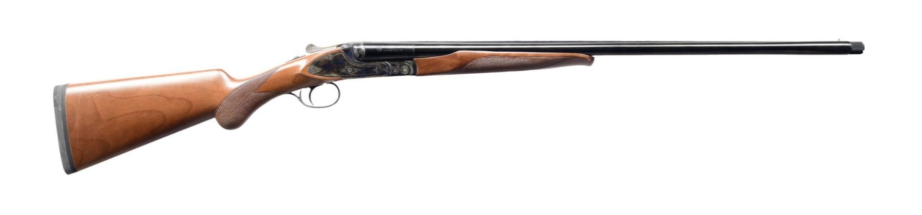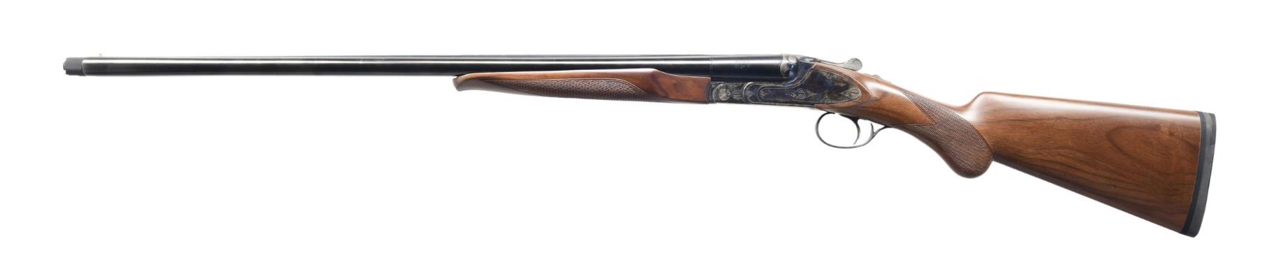 Cal. 20 GA, 3". S# 06C4646. Bbl. 26". Ringneck SxS shotgun mfg. in Turkey by Huglu and imported by CZ USA. Left side of bbls. is marked "HUGLU" above the cal. designation, with CZ's logo and imported information marked on the right. Sides and underside of the receiver exhibit light decorative engraving. Receiver, trigger, trigger guard, lever, and forend hardware exhibit a case color hardened finish, with the bbls. exhibiting a blue finish. Checkered wood rnd. knob buttstock with checkered wood forend. Brass bead front sight. Bbls. feature threaded chokes, with the left bbl. retaining a Carlson's Full choke and the right a Carlson's "LM" choke. All numbers are matching and include the receiver, bbls., and forend. CONDITION: excellent, with metal components retaining bountiful amounts of their original factory finishes overall. Mirror bores. Wood furniture is excellent overall. (24-3143/MLW). MODERN. $300-500.