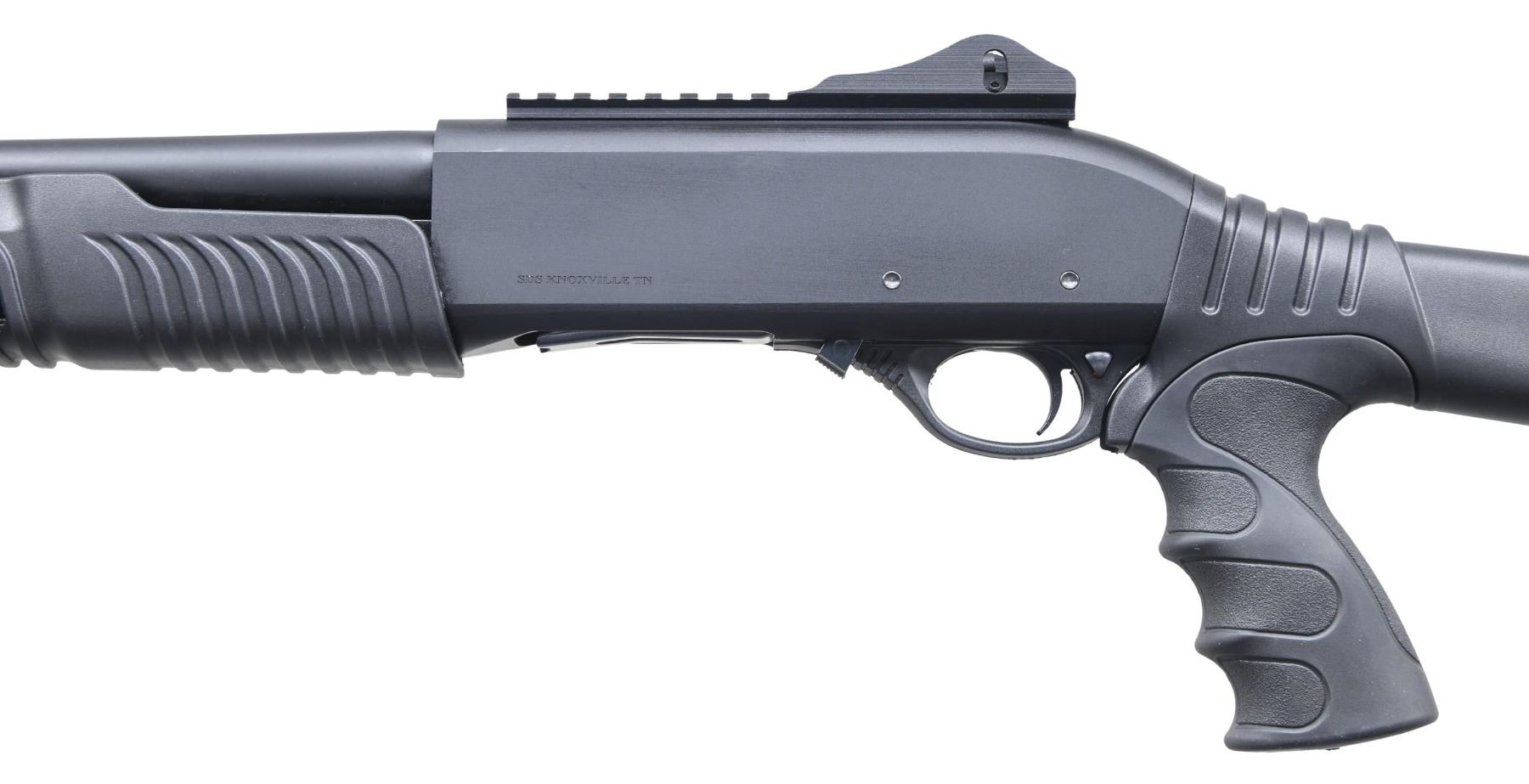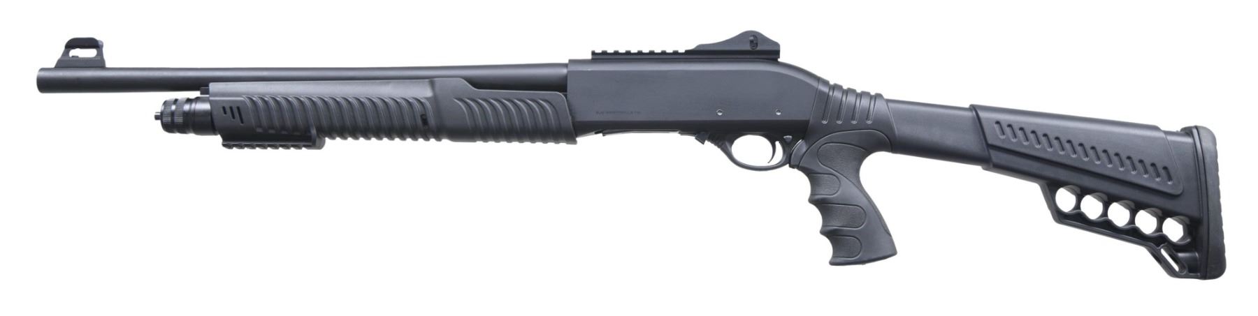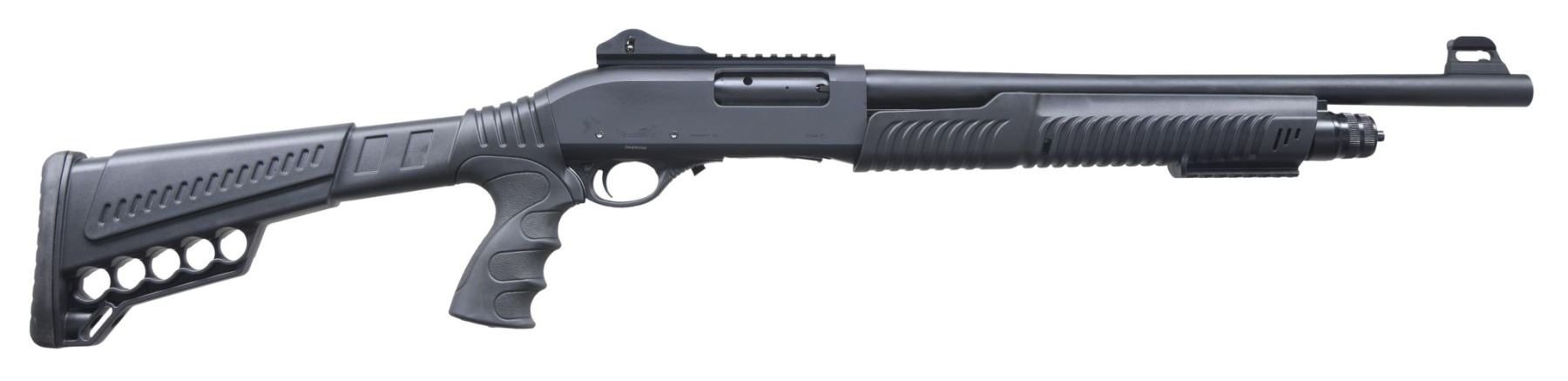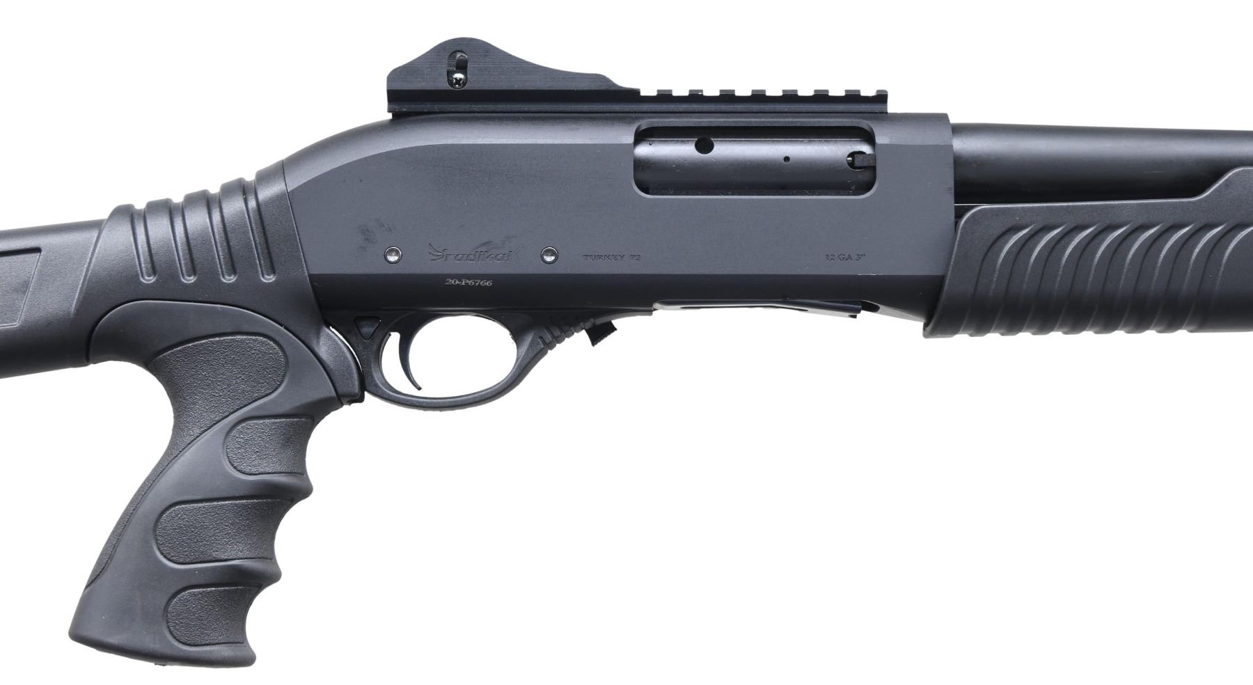 Cal. 12 GA, 3". S# 20-P6766. Bbl. 18 1/2". P3 pump action shotgun, mfg. in Turkey by Radikal and imported by SDS. Left side of receiver is marked with SDS's importer information, with the Radikal logo, S#, model designation, and cal. designation marked on the right. Aluminum receiver and steel bbl. exhibit a matte black finish. Fixed black polymer buttstock with textured black rubber pistol grip and grooved black polymer pump. Red fiber optic front sight with ghost ring rear sight. Bbl. is fitted with a threaded, modified choke. UNATTACHED ACCESSORIES: matching box. CONDITION: near new, with metal components retaining virtually all of their original factory finishes overall. Mirror bore, exhibiting some grease throughout. Polymer furniture is excellent. Box shows some light to mild exterior wear but otherwise remains sturdy and serviceable. PROVENANCE: from the collection of Gun Sport Ltd., owned by Jon R. Thomas. (23-3782/MLW). MODERN. $200-400.