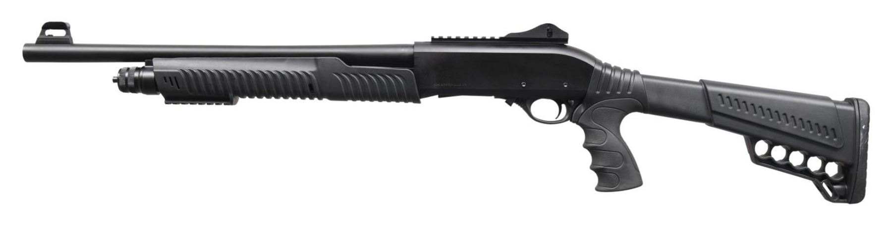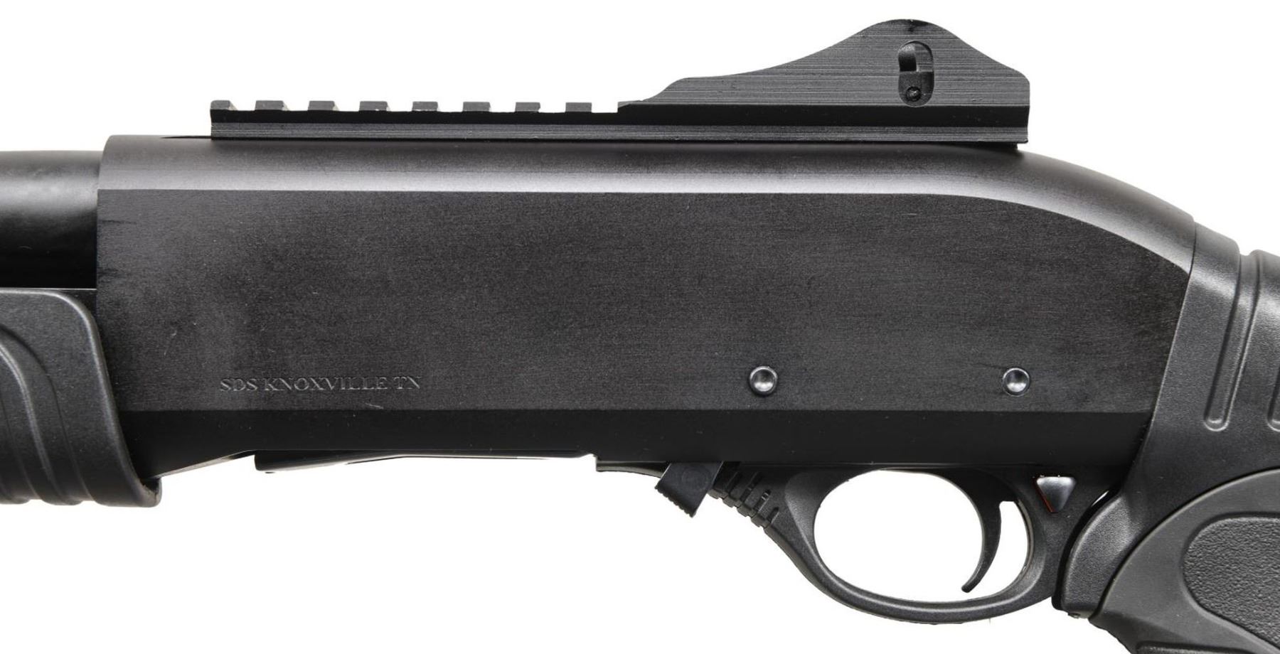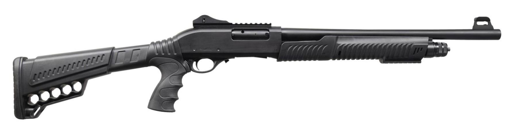 Cal. 12 GA, 3". S# 20-P0501. Bbl 18 5/8". P3 pump action shotgun, mfg. in Turkey and imported by SDS of Knoxville, TN. Left side of the receiver exhibits SDS's mfg. information, with the right side exhibiting markings stipulating the model designation, cal. designation, and S#. Black anodized aluminum receiver with matte black steel bbl. Black polymer pistol grip stock with grooved pump. Red fiber optic front sight with ghost ring rear sight. UNATTACHED ACCESSORIES: matching factory box. CONDITION: near new, with metal components retaining virtually all of their original factory finishes overall. Mirror bore, exhibiting some hardened factory grease. Polymer furniture is excellent. Box shows some mild exterior wear but otherwise remains sturdy and serviceable. PROVENANCE: from the collection of Gun Sport Ltd., owned by Jon R. Thomas. (23-3788/MLW). MODERN. $200-400.