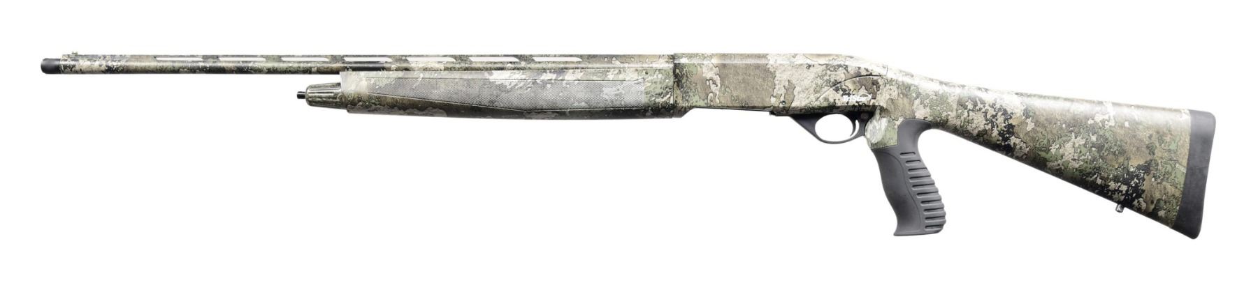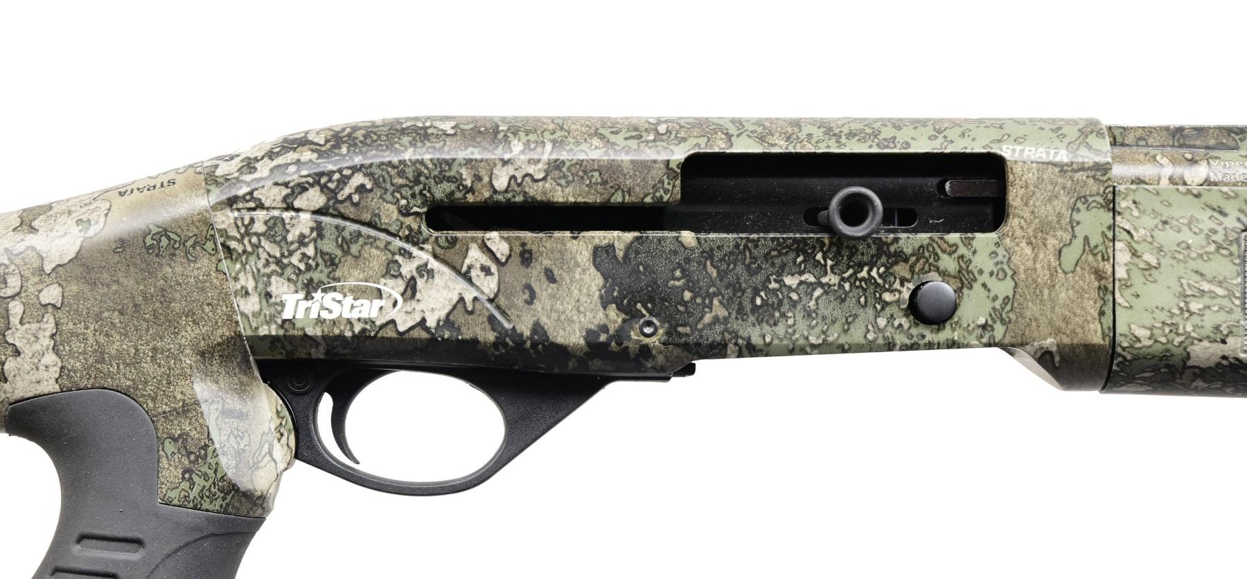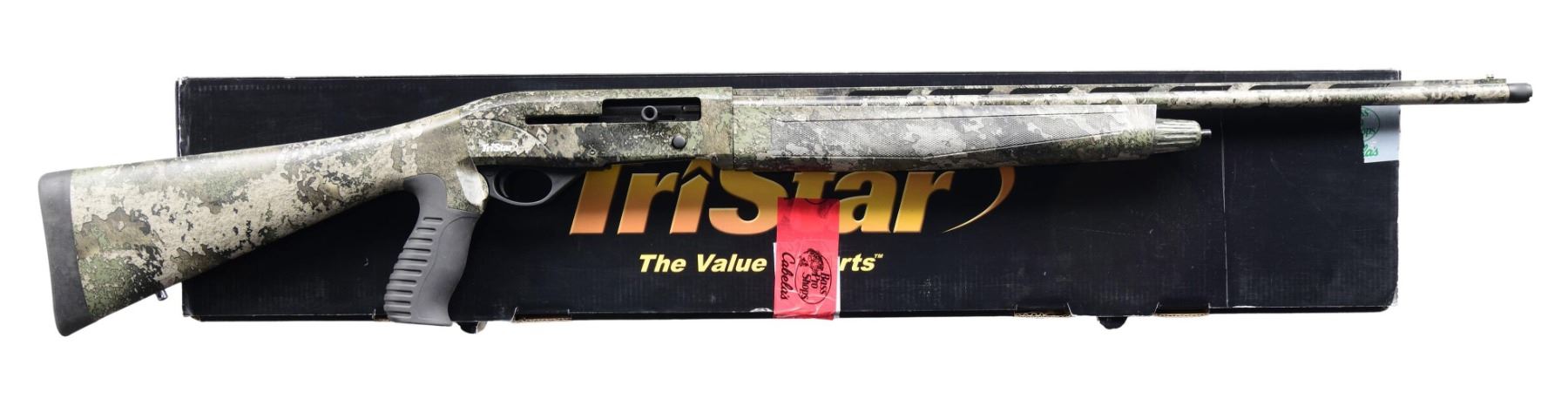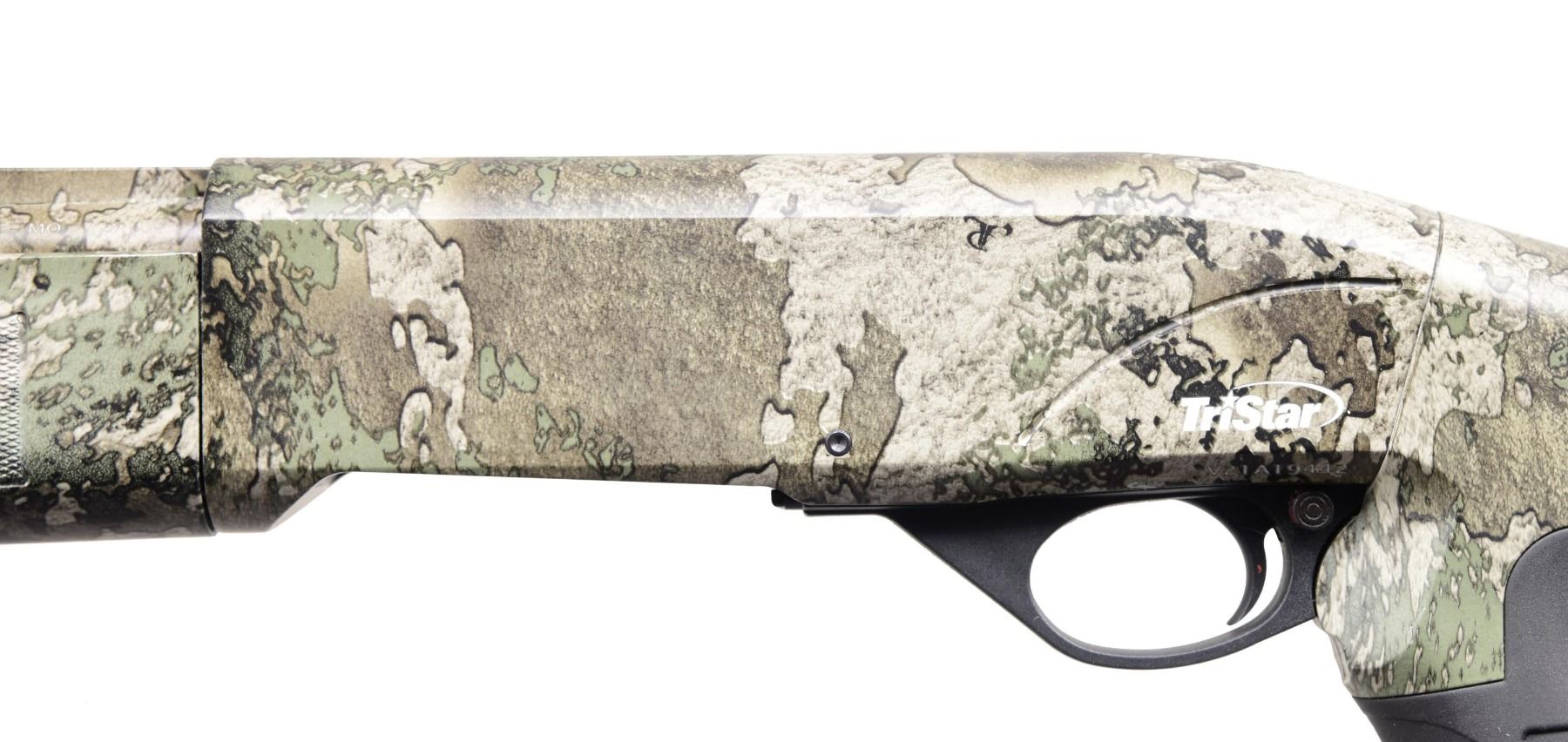 SHOTGUN WITH MATCHING BOX. Cal. 410 GA, 3". S# V21A19442. Bbl. 24". Viper semi-automatic shotgun mfg. in Turkey by Armsan and imported/retailed by TriStar. Left side of bbl. is marked with TriStar's importer information, with the model and cal. designation above "Made in Turkey by Armsan" marked on the right. Sides of the receiver exhibit TriStar's logo, with the left also exhibiting the S#. Aluminum receiver, steel bbl., as well as the polymer buttstock and checkered forend exhibit a "Strata" camouflage finish. Stock is fitted with a grooved black rubber pistol grip. Black polymer trigger guard. Matte V/R with green fiber optic front sight. Bbl. is fitted with a threaded choke marked "TKY." UNATTACHED ACCESSORIES: matching importer box containing choke set. CONDITION: near new, with the exterior retaining virtually all of its original factory camouflage finish. Mirror bore. Box exhibits some light to mild exterior wear from handling and storage but otherwise remains sturdy and serviceable. (24-2734/MLW). MODERN. $400-600.