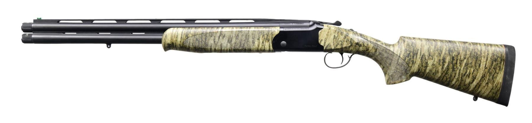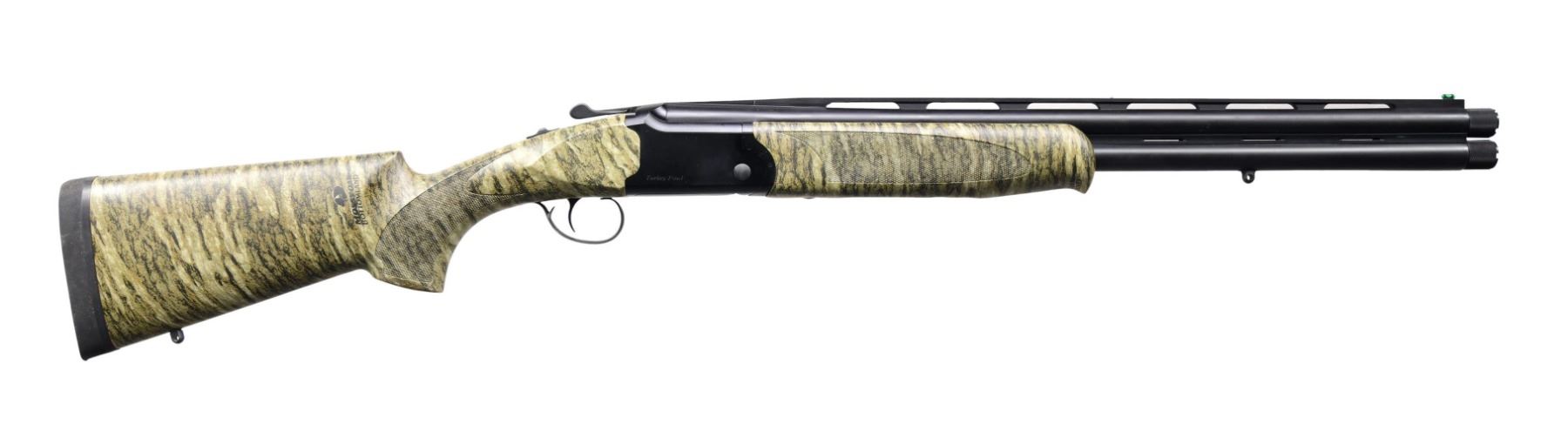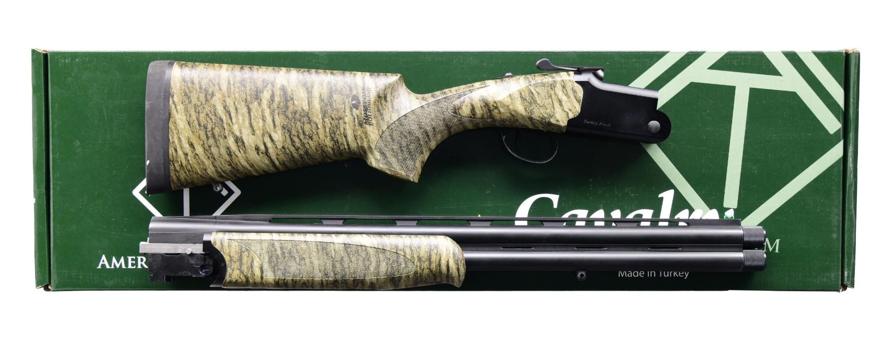 MATCHING IMPORTER BOX. Cal. 12 GA, 3". S# 720-H22UU-37169. Bbl. 22". Turkey Fowl O/U shotgun mfg. in Turkey by KOFS and imported by ATI. Left side of upper bbl. is marked with the cal. designation. Sides of the receiver are marked "Turkey Fowl", with ATI's importer information also marked on the left. Underside of receiver is marked "KOFS/ Turkey". Metal components exhibit a matte black finish. Checkered wood pistol grip buttstock and schnabel tip forend exhibit Mossy Oak's Bottomland camouflage finish. V/R with green fiber optic front sight. Bbls. feature threaded chokes, with the top bbl. retaining a Carlson's Improved Modified choke and the bottom bbl. retaining a Carlson's "LM" marked choke. UNATTACHED ACCESSORIES: matching importer box. CONDITION: excellent, with metal components retaining virtually all of their original factory finish overall. Mirror bores. Wood furniture is excellent. Box exhibits some light exterior wear but otherwise remains sturdy and serviceable. (24-3118/MLW). MODERN. $300-500.